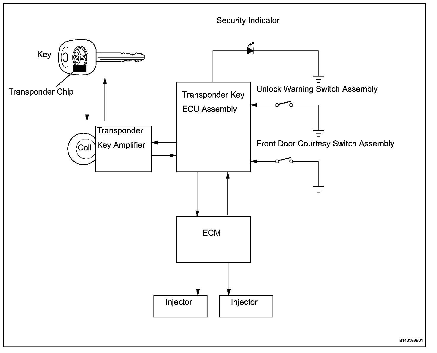 - When the transponder key ECU assembly detects that the unlock warning switch is ON, the ECU provides current to the transponder key coil and produces a faint electric wave. A transponder chip in the key grip receives the faint electric wave. Upon receiving the faint electric wave, the transponder chip outputs a key ID code signal. The transponder key coil receives this signal, the transponder key amplifier amplifies it, and then the signal is transmitted to the ECU. The ECU compares the key's ID code with the vehicle's ID code, which was previously registered in the ECU and then communicates the results to the ECM using the SFI communication.