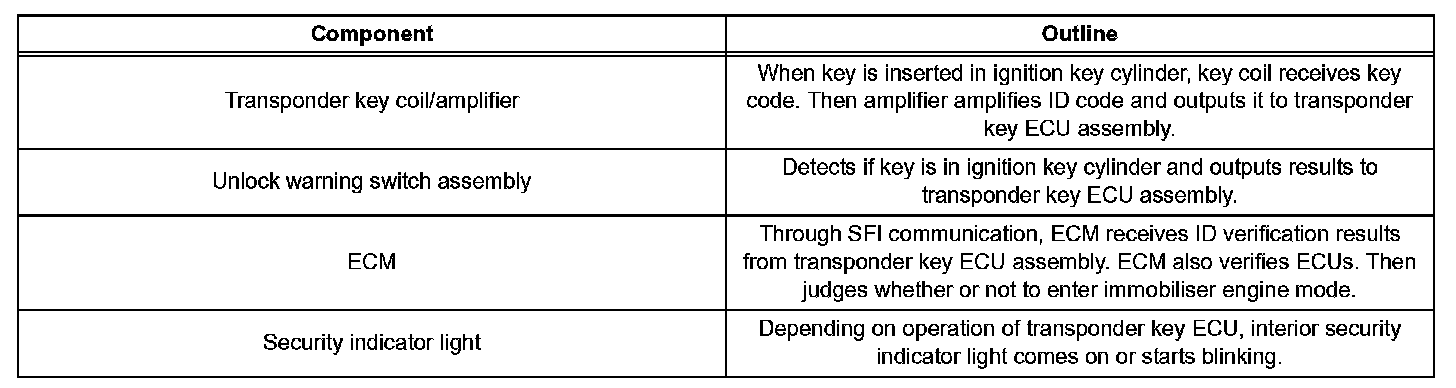 The engine immobilizer system is designed to prevent the vehicle from being stolen. This system uses a transponder key ECU that stores the key codes of authorized ignition keys. If an attempt is made to start the engine using an unauthorized key, the ECU sends a signal to the ECM to prohibit fuel delivery and ignition, effectively disabling the engine.