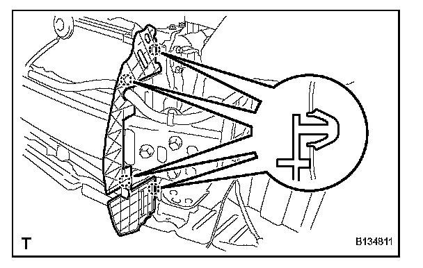 b. Disengage the 2 claws and remove the front bumper side retainer.