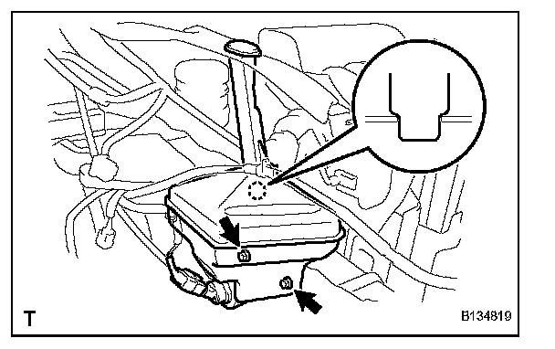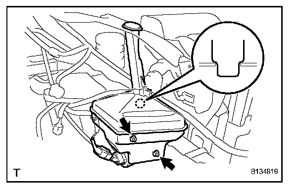 a. Insert the location pin into the body hole and install the windshield washer jar with the 2 bolts.