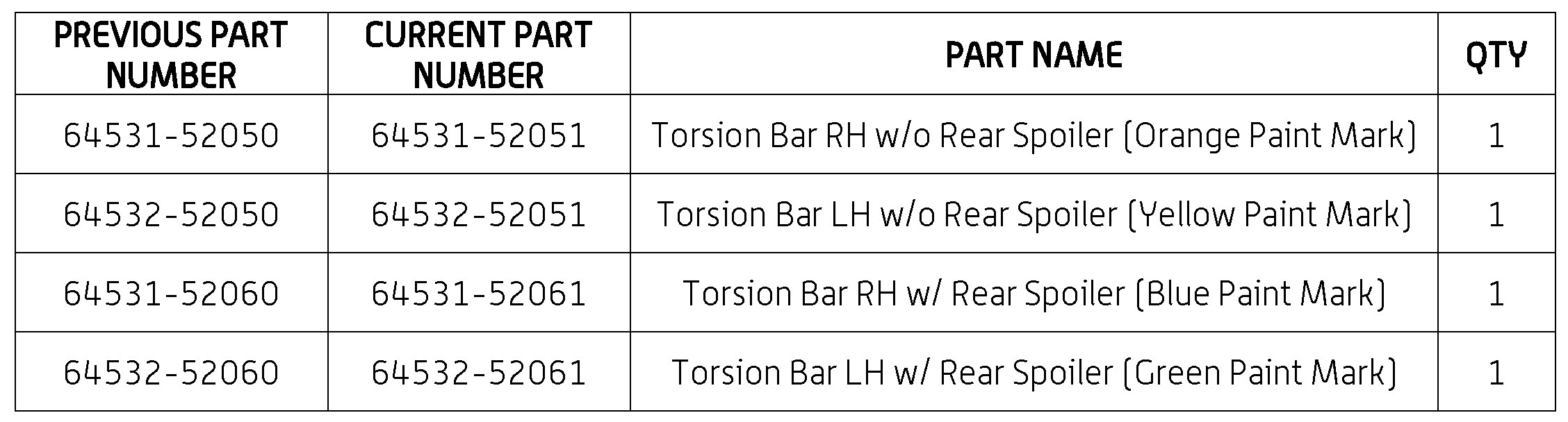 - A yellow paint mark is used on torsion bars for vehicles w/o rear spoiler.