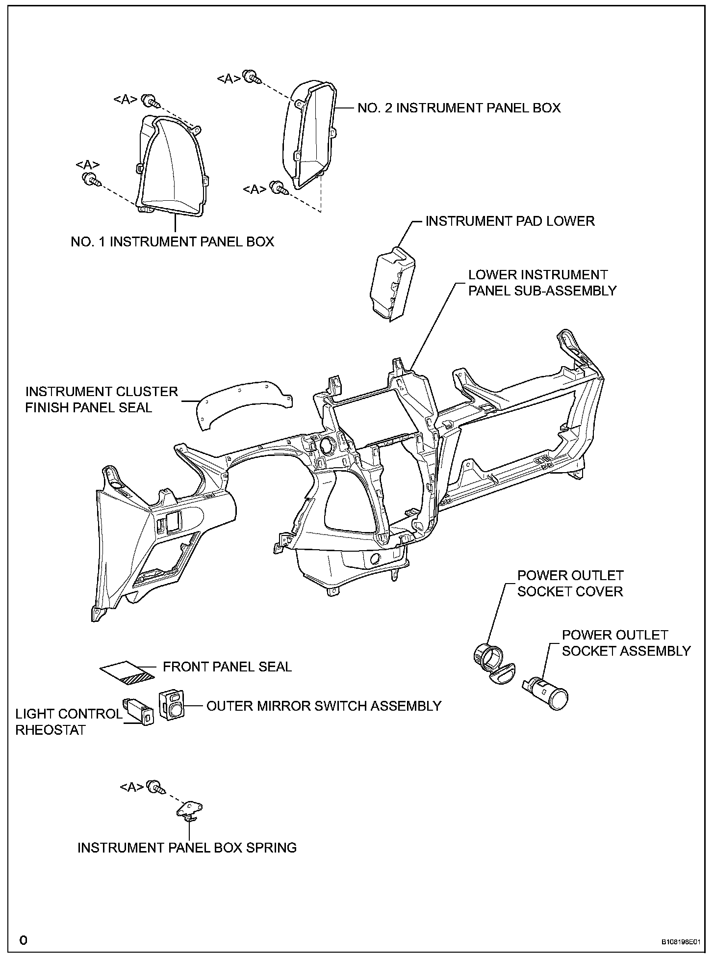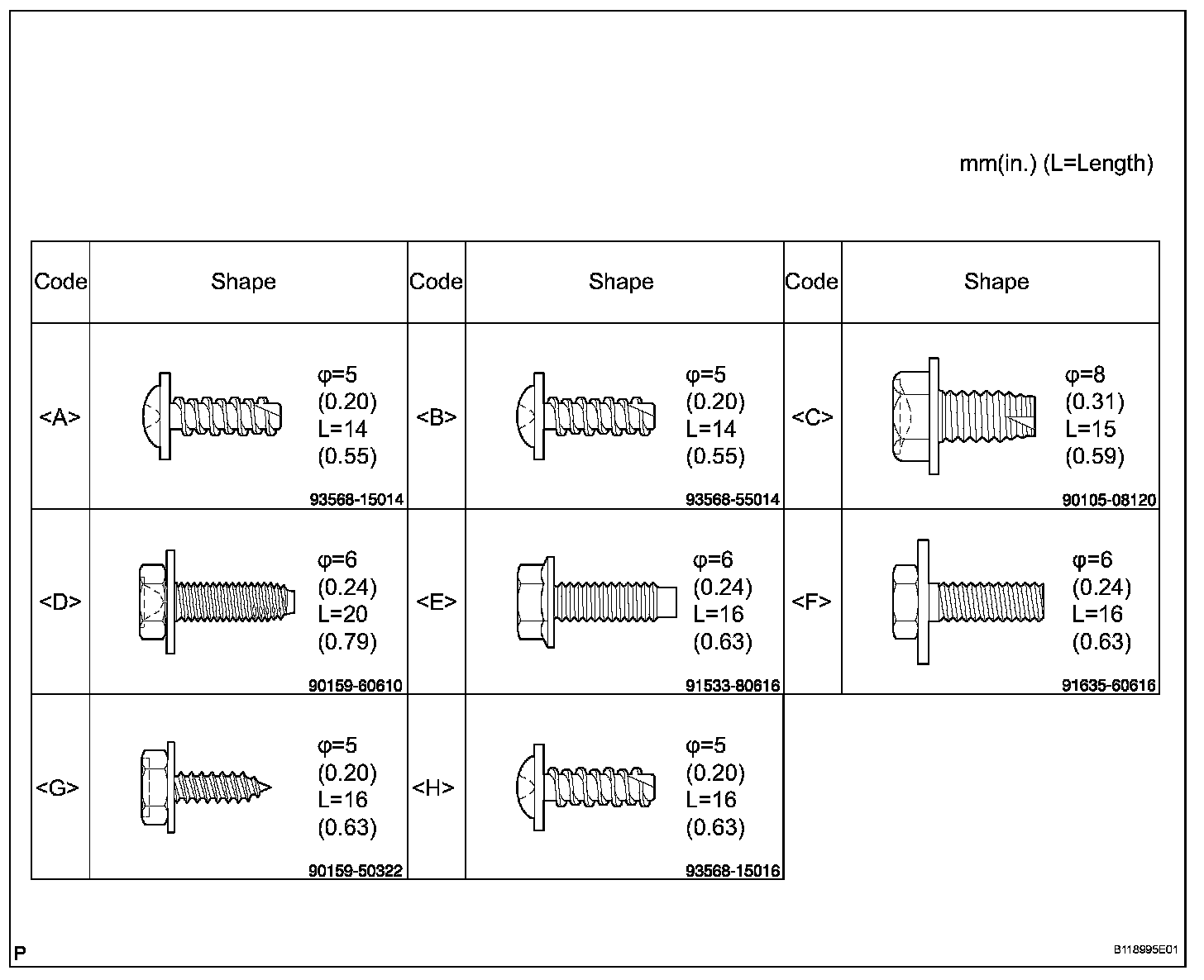 HINT: All bolts, screws and nuts relevant to installing and removing the instrument panel are shown, along with their alphabetic codes, in the table below.