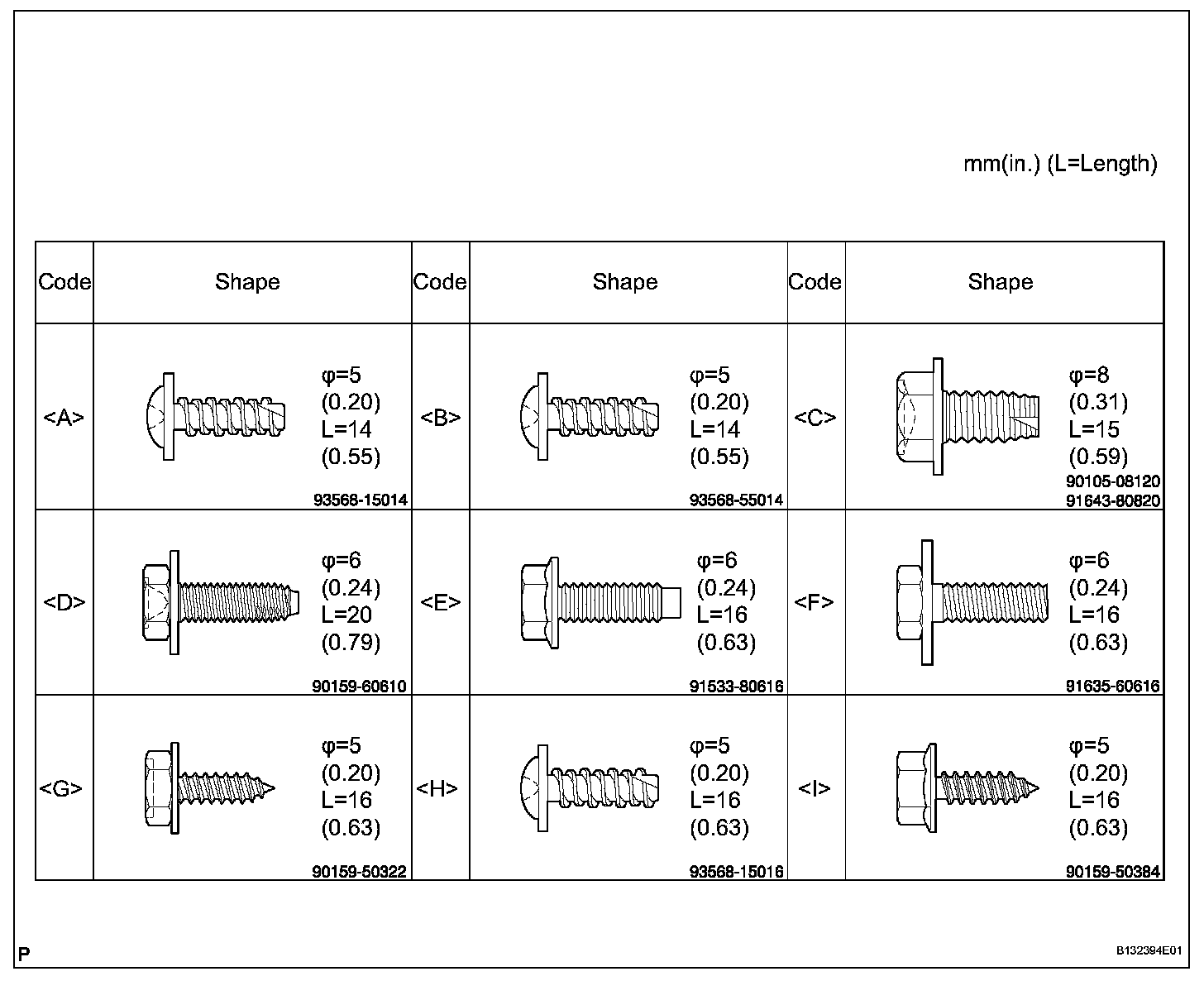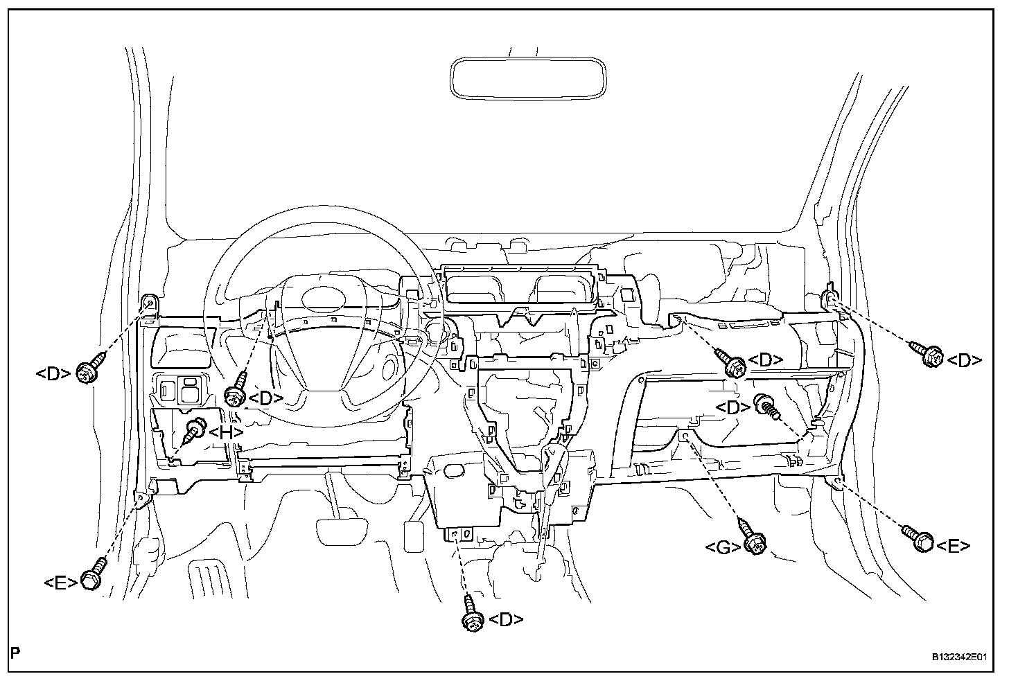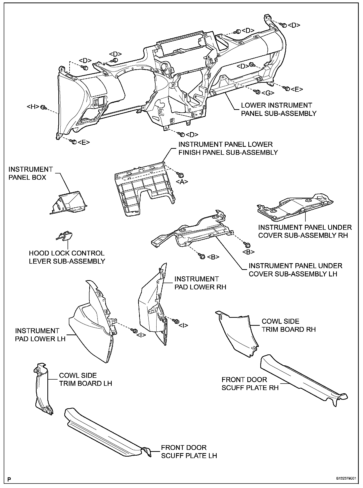 HINT: All bolts, screws and nuts relevant to installing and removing the instrument panel are shown, along with their alphabetic codes, in the table below.