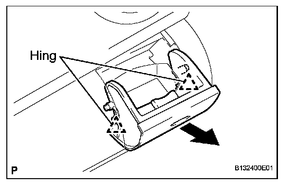 c. Remove the instrument panel cup holder by moving it toward either the inside or the outside of the vehicle and disengaging the 2 hinges one at a time.