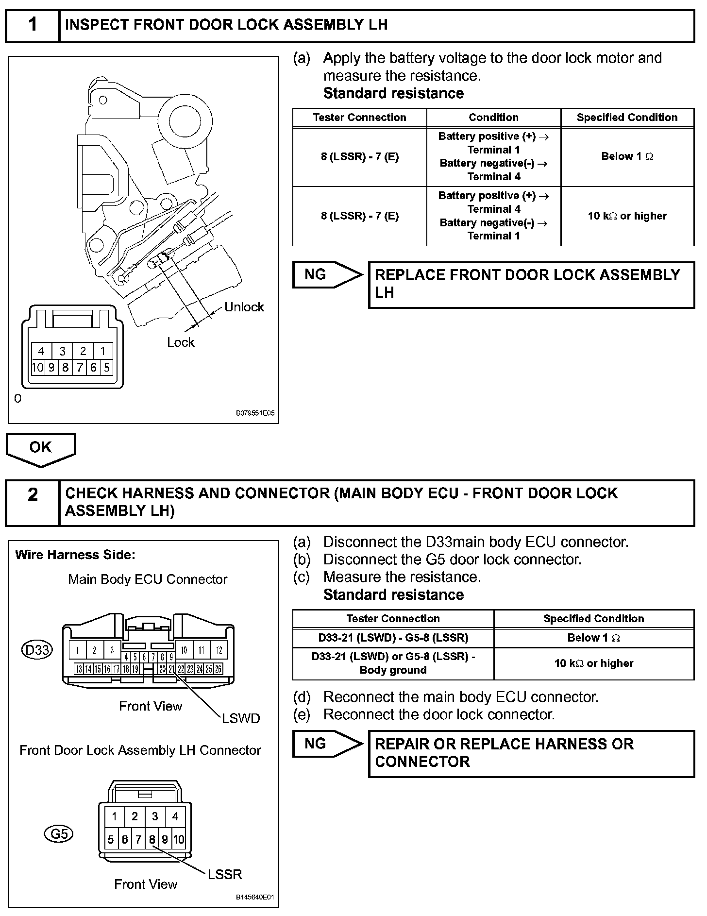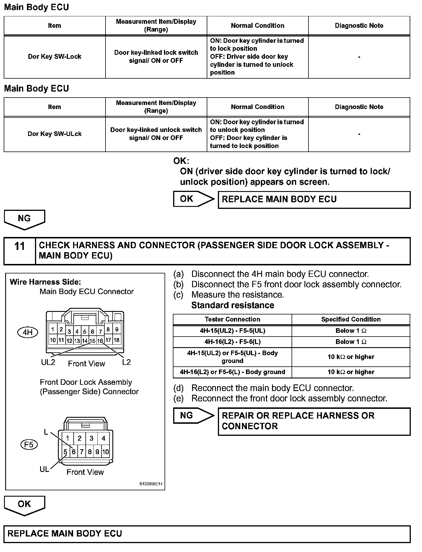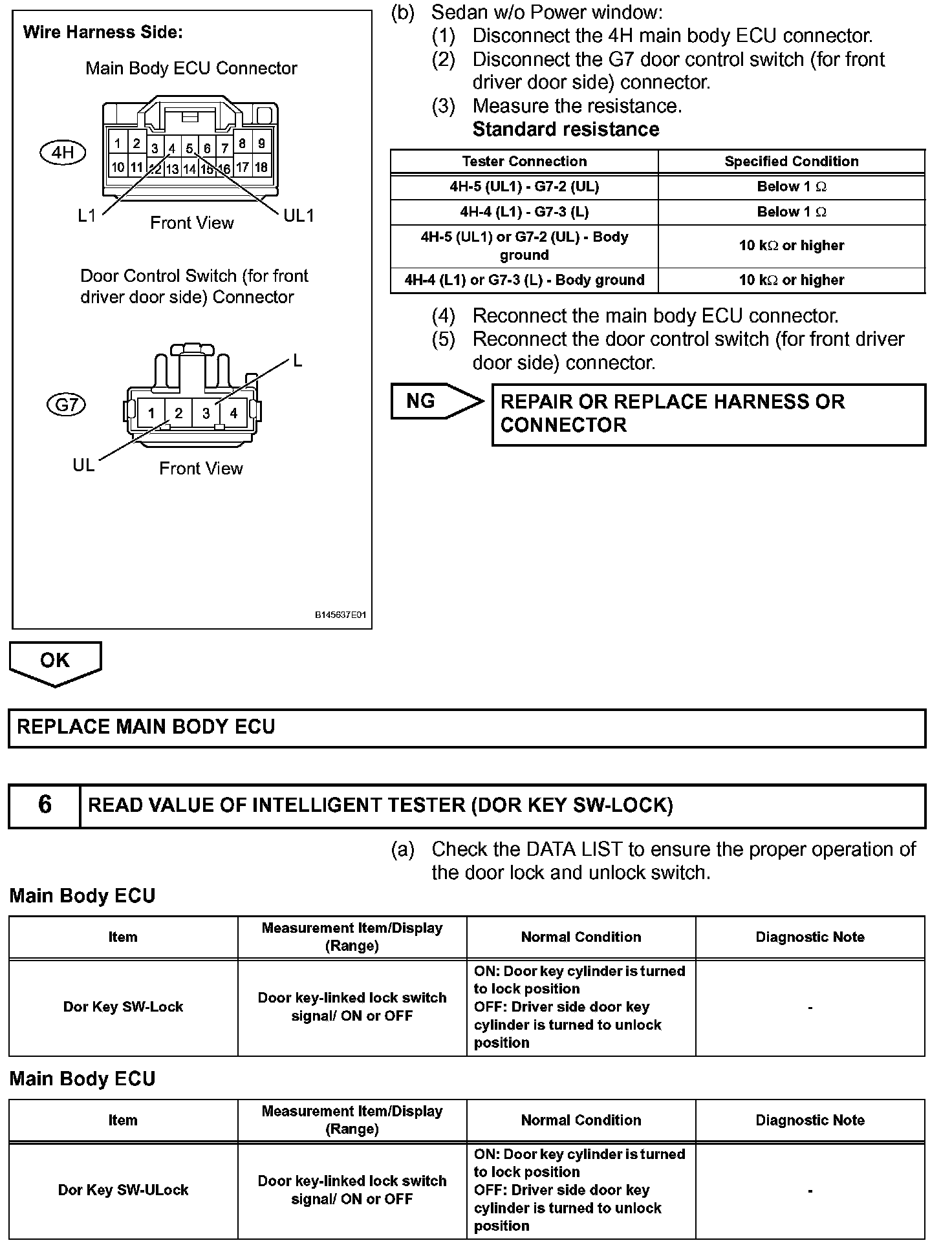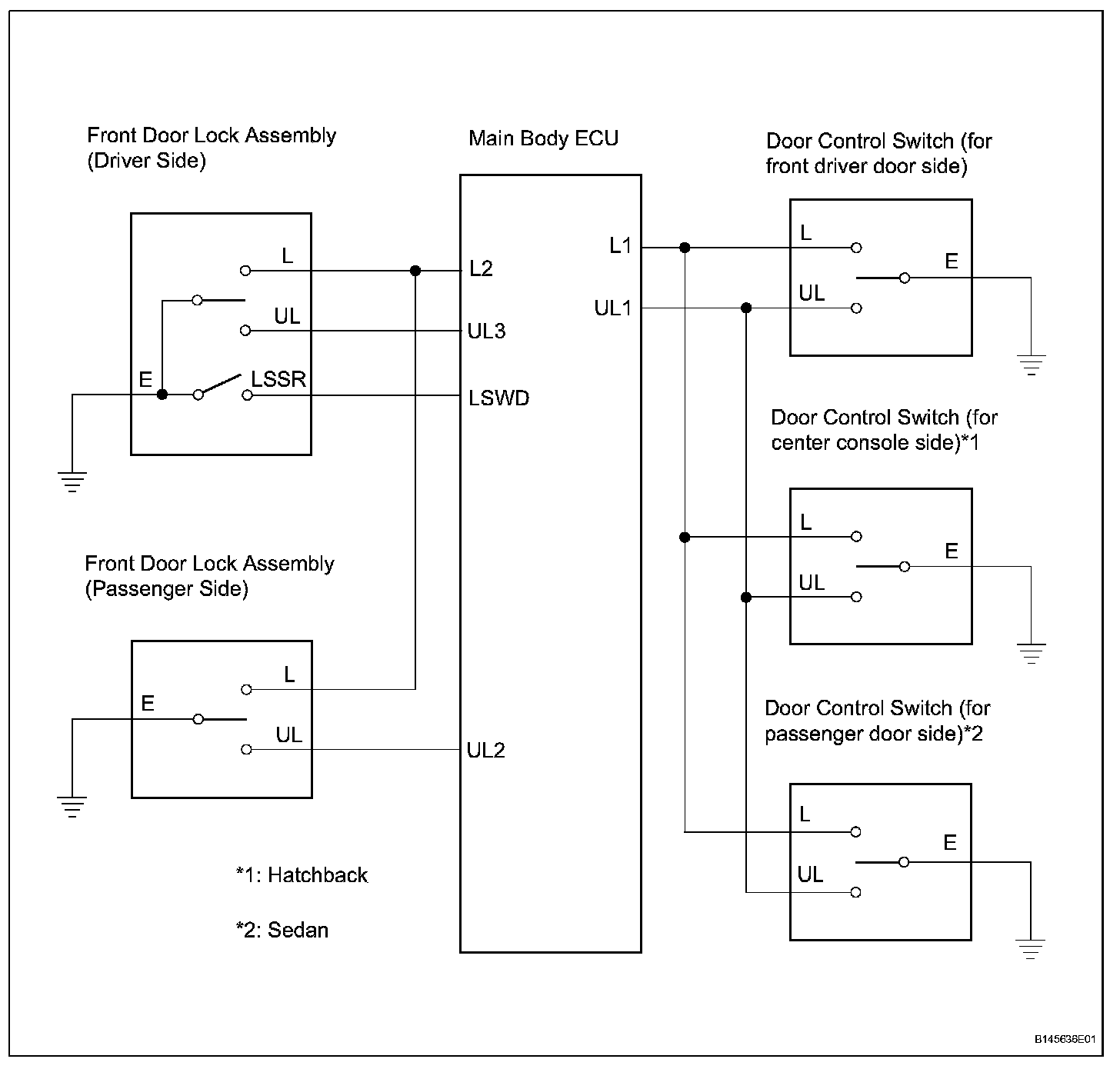 The main body ECU receives switch signals from the door control switch and driver side door key cylinder, and activates the door lock motor on each door accordingly.