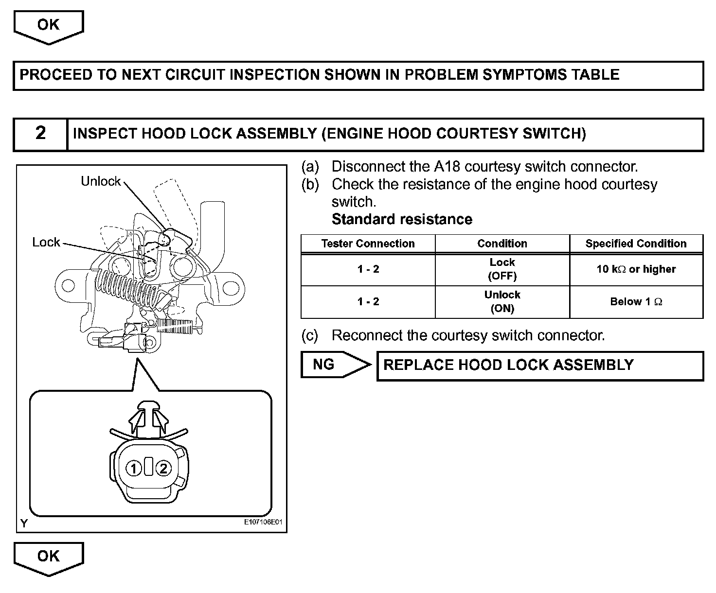 The engine hood courtesy switch is built into the engine hood lock assembly. The switch turns on when the engine hood is opened and turns off when the engine hood is closed.