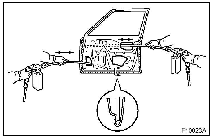 1. To preserve impossible to paint areas from corrosion, always apply sufficient anti-rust agent (wax) to the inside of the hemming areas of the doors and hood, and around the hinges, or the welded surfaces inside the box-shaped cross sections of the side members, body pillar, etc.