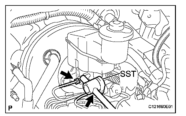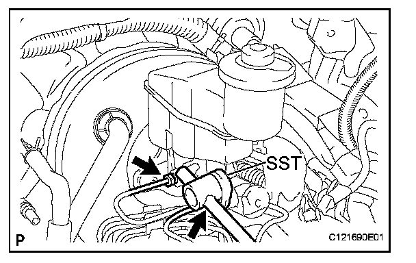 e. Using SST, install the 2 brake tubes onto the brake master cylinder.