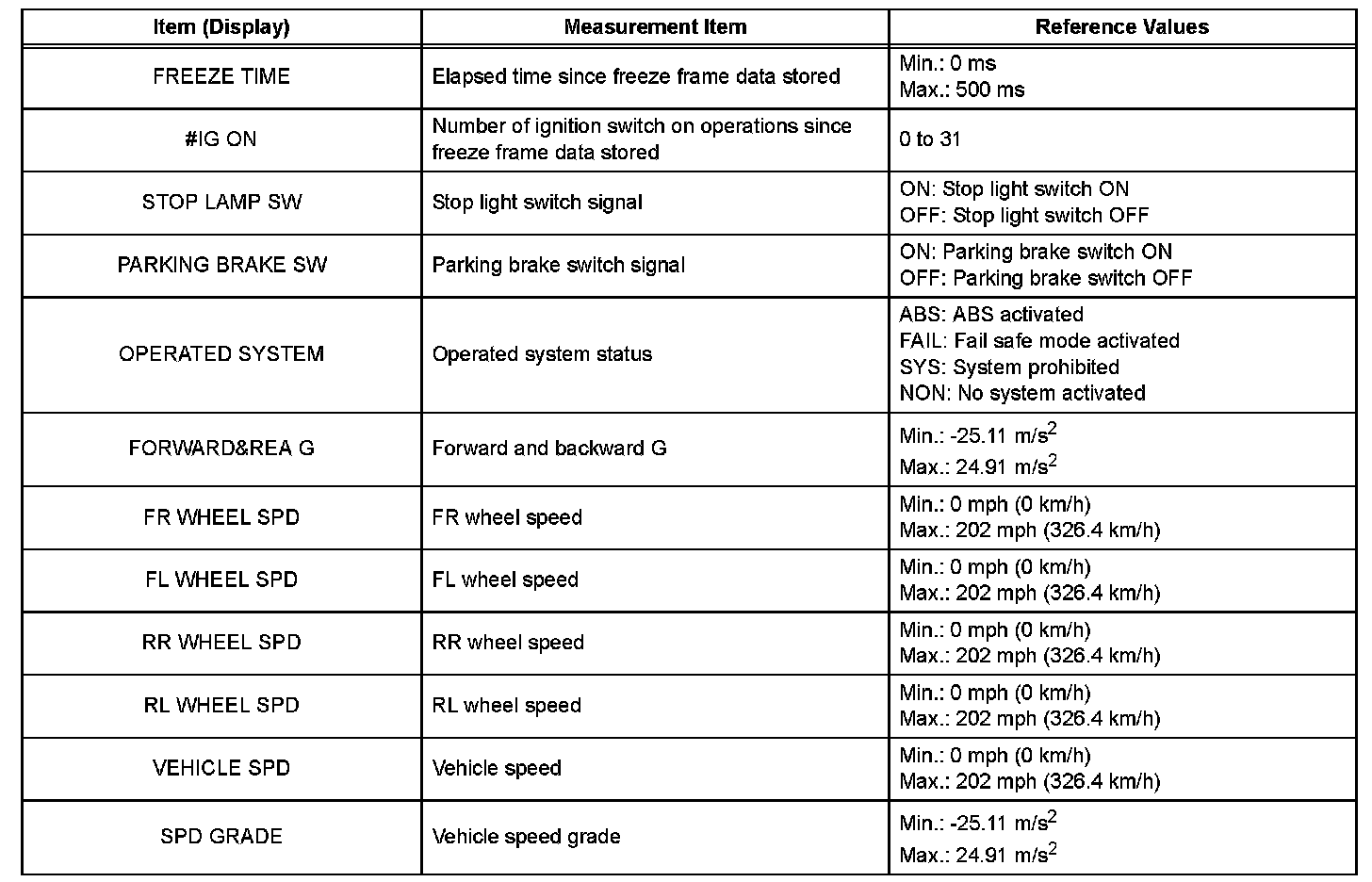 - Freeze frame data at the time the ABS operates: