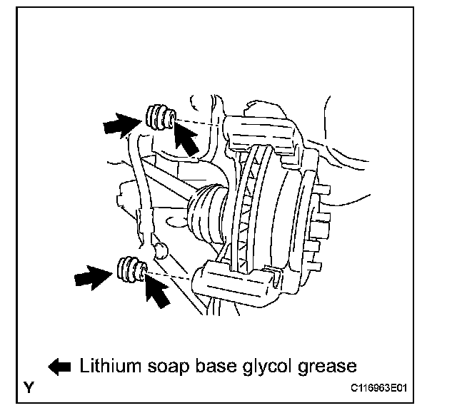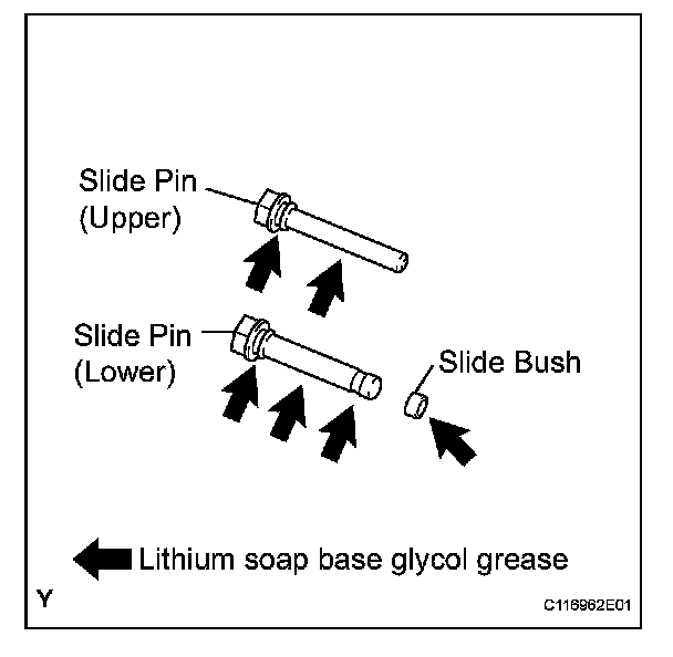 (a) Apply lithium soap base glycol grease to the slide pins and a new slide bush, as shown in the illustration.