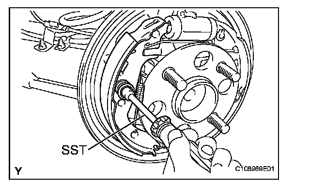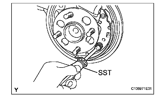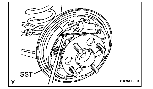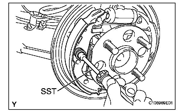 (c) Using SST, install the rear brake shoe, pin, shoe hold down spring and shoe hold down spring cup.