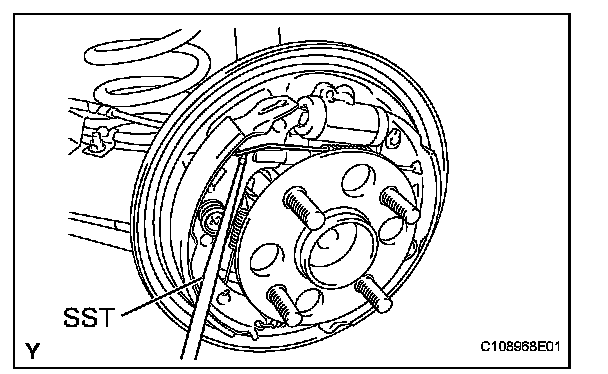 (h) Using SST, install the shoe return spring onto the front brake shoe.