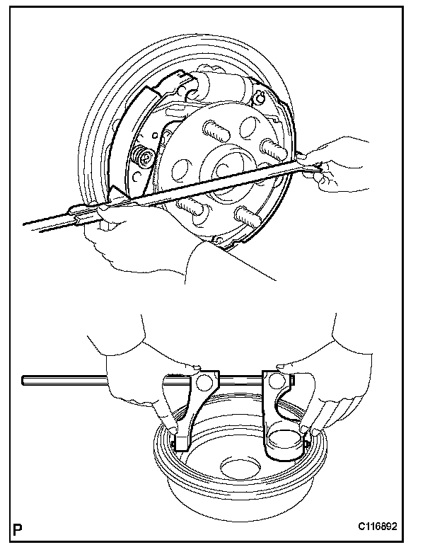 (b) Measure the brake drum inner diameter and the diameter of the brake shoes. Check that the difference between the diameters is equal to the specified shoe clearance.