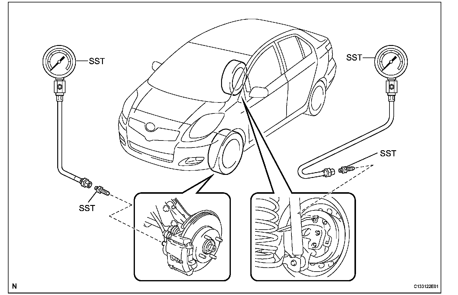 HINT: When inspecting the fluid pressure, inspect the left front and right rear together, and the right front and left rear together.