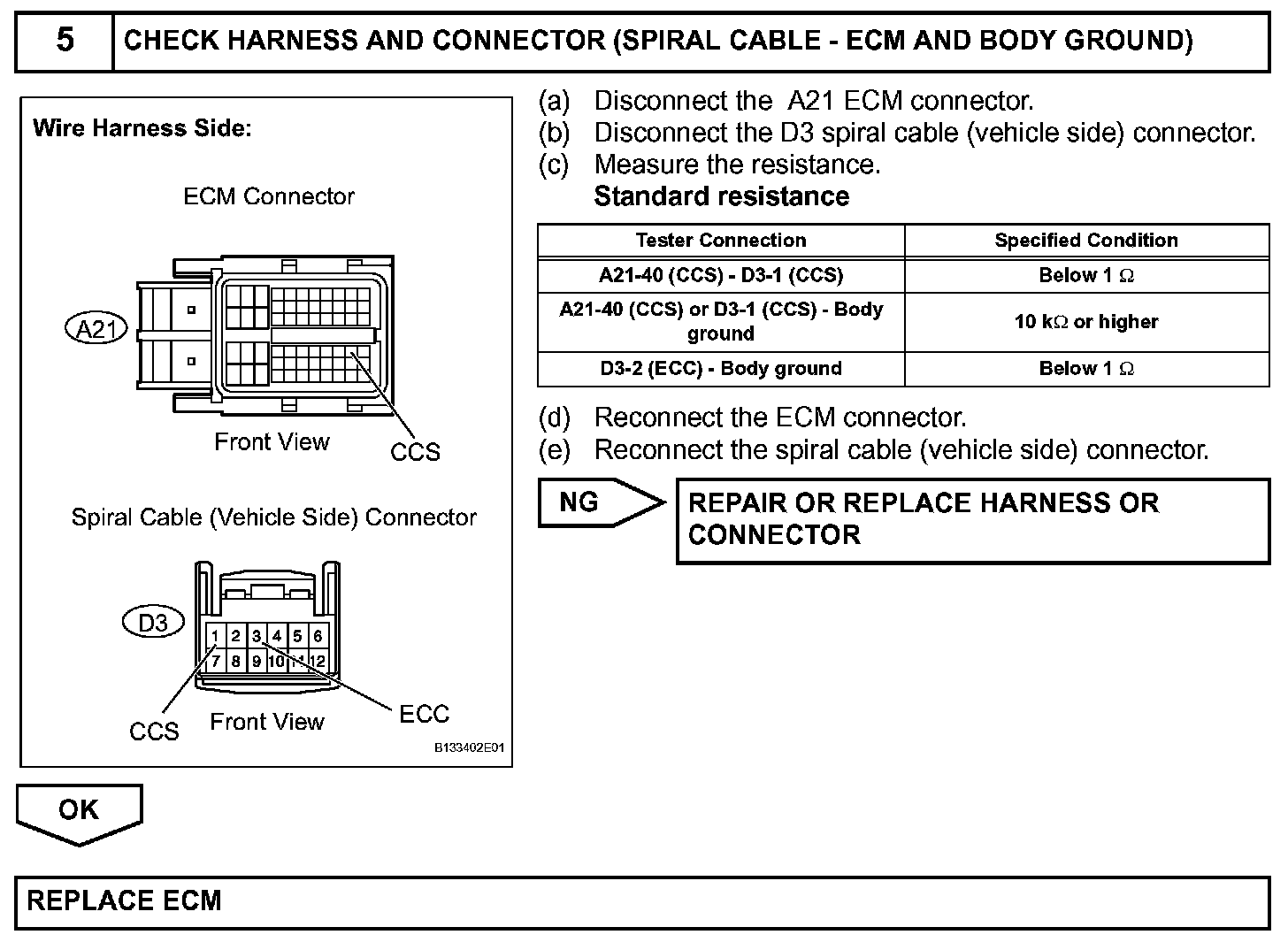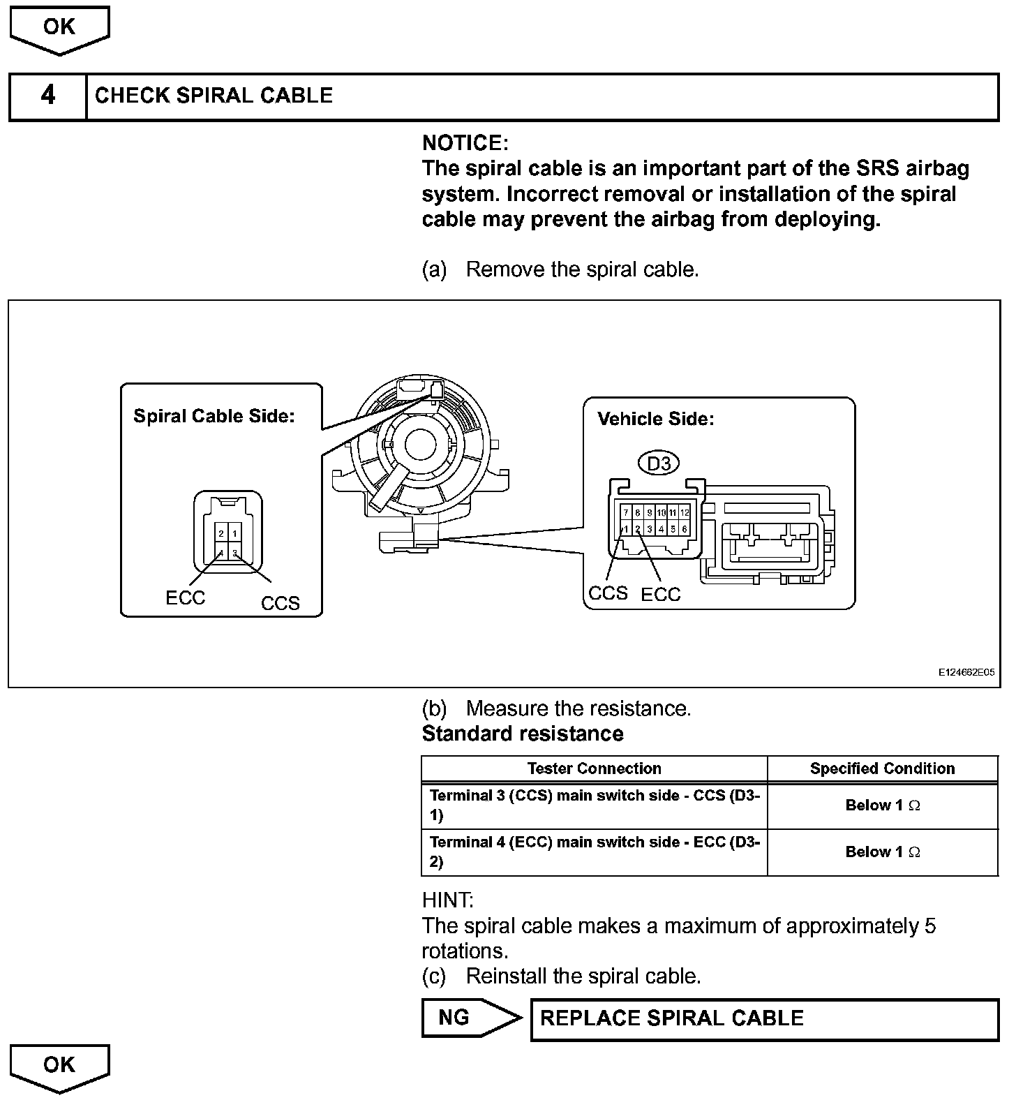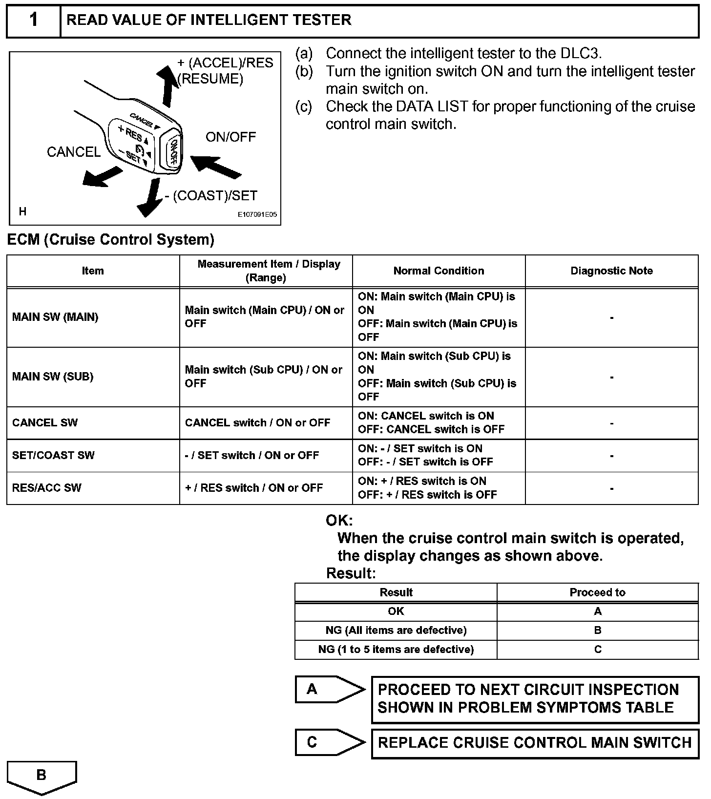 The cruise control main switch operates 7 functions: SET, - (COAST), TAP-DOWN, RES (RESUME), + (ACCEL), TAP-UP, and CANCEL. The SET, TAP-DOWN, and - (COAST) functions, and the RES (RESUME), TAP-UP, and + (ACCEL) functions are operated with the same switch. The cruise control main switch is an automatic return type switch which turns on only while operated in the directions of the arrows and turns off when it is released. The internal contact point of the cruise control main switch is turned on with the switch operation. Then the ECM reads the voltage value that has been changed by the switch operation to control SET, - (COAST), RES (RESUME), + (ACCEL), and CANCEL.