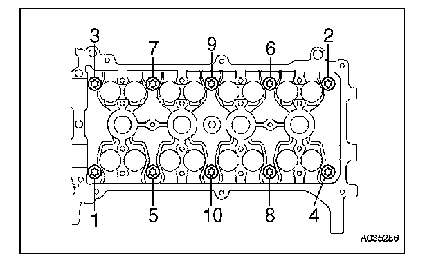 (a) Using several steps, uniformly loosen and remove the 10 cylinder head bolts with an 8 mm bi-hexagon wrench in the sequence shown in the illustration. Remove the 10 plate washers.