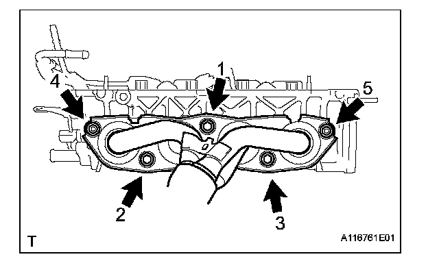 (a) Using several steps, install a new exhaust manifold gasket and the exhaust manifold with the 3 bolts and 2 nuts in the sequence shown in the illustration.
