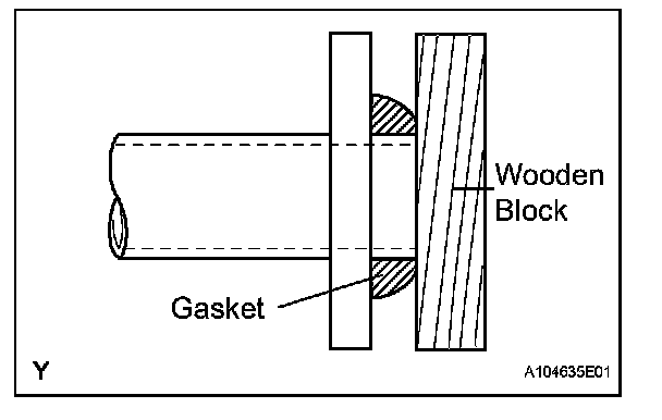 (b) Using a plastic hammer and a wooden block, tap in a new exhaust pipe gasket until its surface is flush with the exhaust manifold.