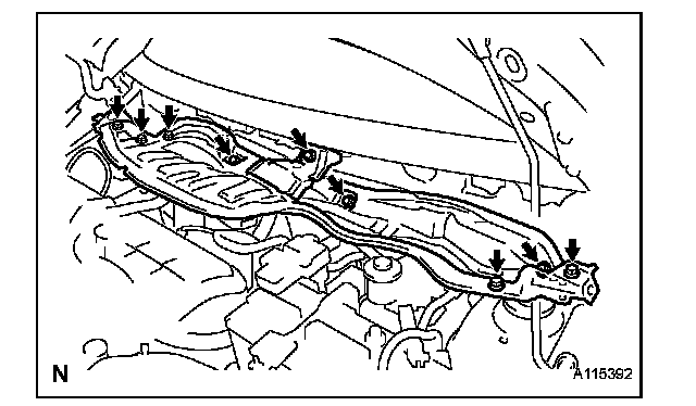 (b) Remove the 2 bolts and remove the cowl top to cowl inner brace.