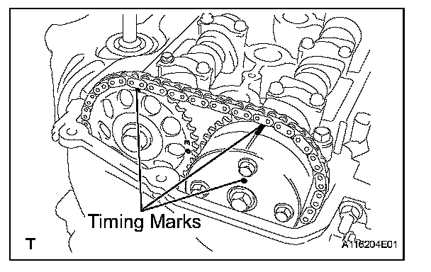 (2) Check that the timing marks on the camshaft timing sprocket and the camshaft timing gear are all facing upward, as shown in the illustration.