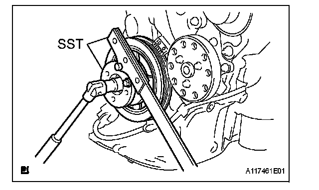(b) Using 2 SSTs, loosen the bolt while holding the crankshaft damper sub-assembly.