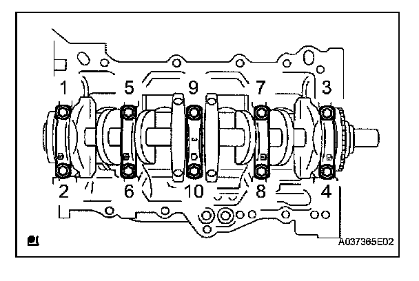 (a) Using several steps, loosen and remove the 10 bearing cap sub-assembly bolts uniformly with SST in the sequence shown in the illustration.