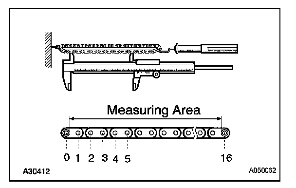 (a) Using a spring scale, apply 140 N (14.3 kgf, 31.5 lb) to the timing chain and measure its length.