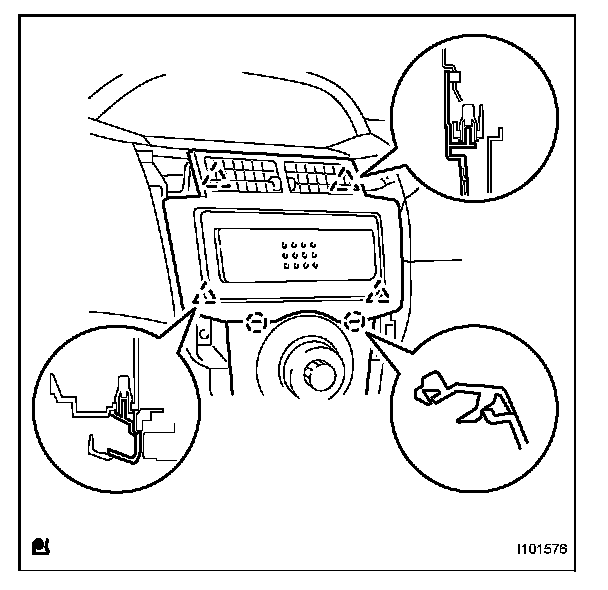 - To avoid breakage of the instrument cluster finish panel center when removing it, do not apply excessive force to the register or pull out the rink or panel portions.