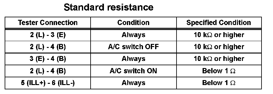 1. Using an ohmmeter, measure the resistance and check the results in accordance with the values in the table given.