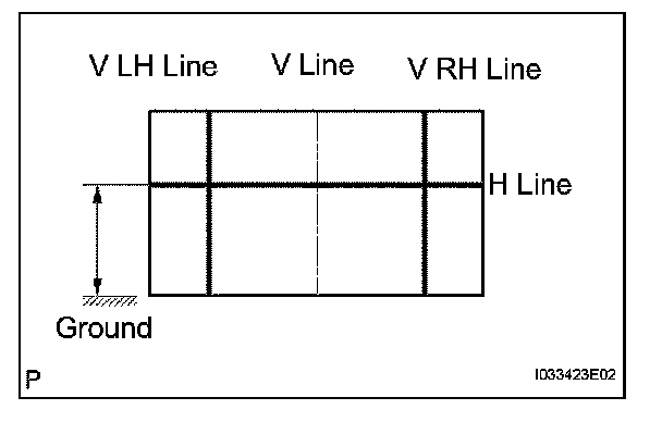 Draw a horizontal line across the screen so that it passes through the center marks. The H line should be at the same height as the headlight bulb center marks of the low-beam headlights.