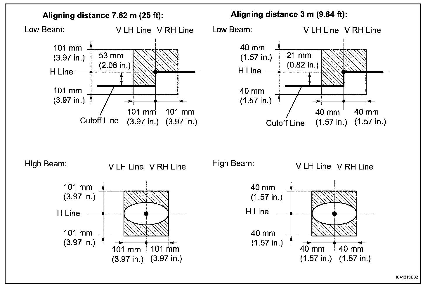 The cutoff line is 101 mm (3.97 in.) above and below the H line as well as to the left and right of the V line with high-beam (SAE J599).