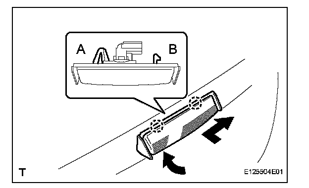 a. Pull the license plate light assembly in the direction indicated by arrow 1, shown in the illustration. Disengage claw B by pulling claw A toward you while flexing it and remove the license plate light assembly.