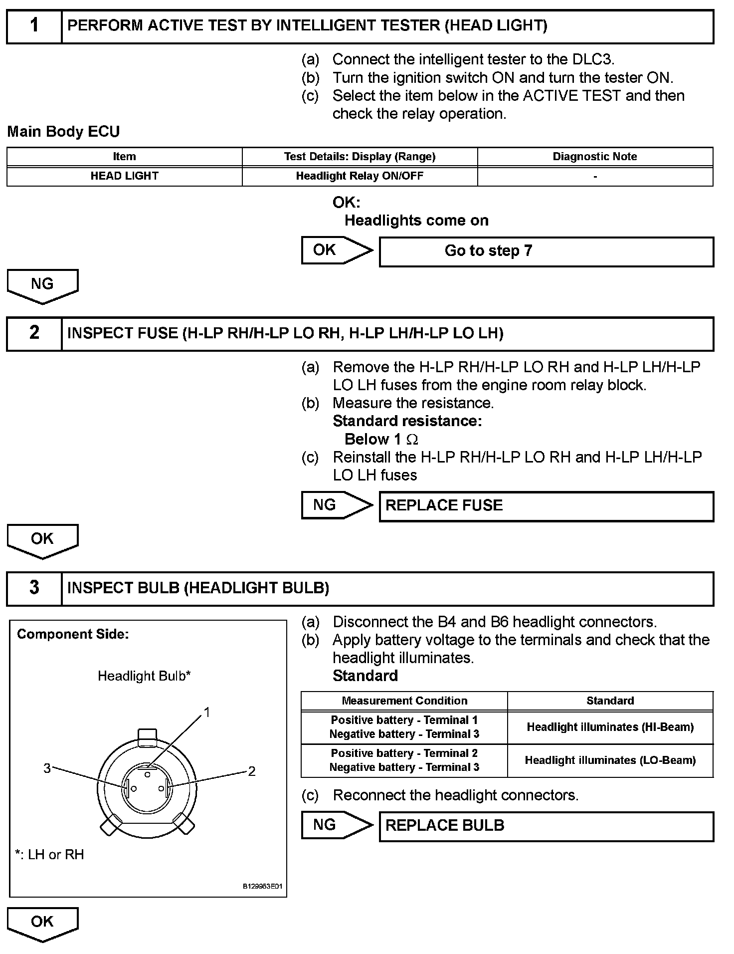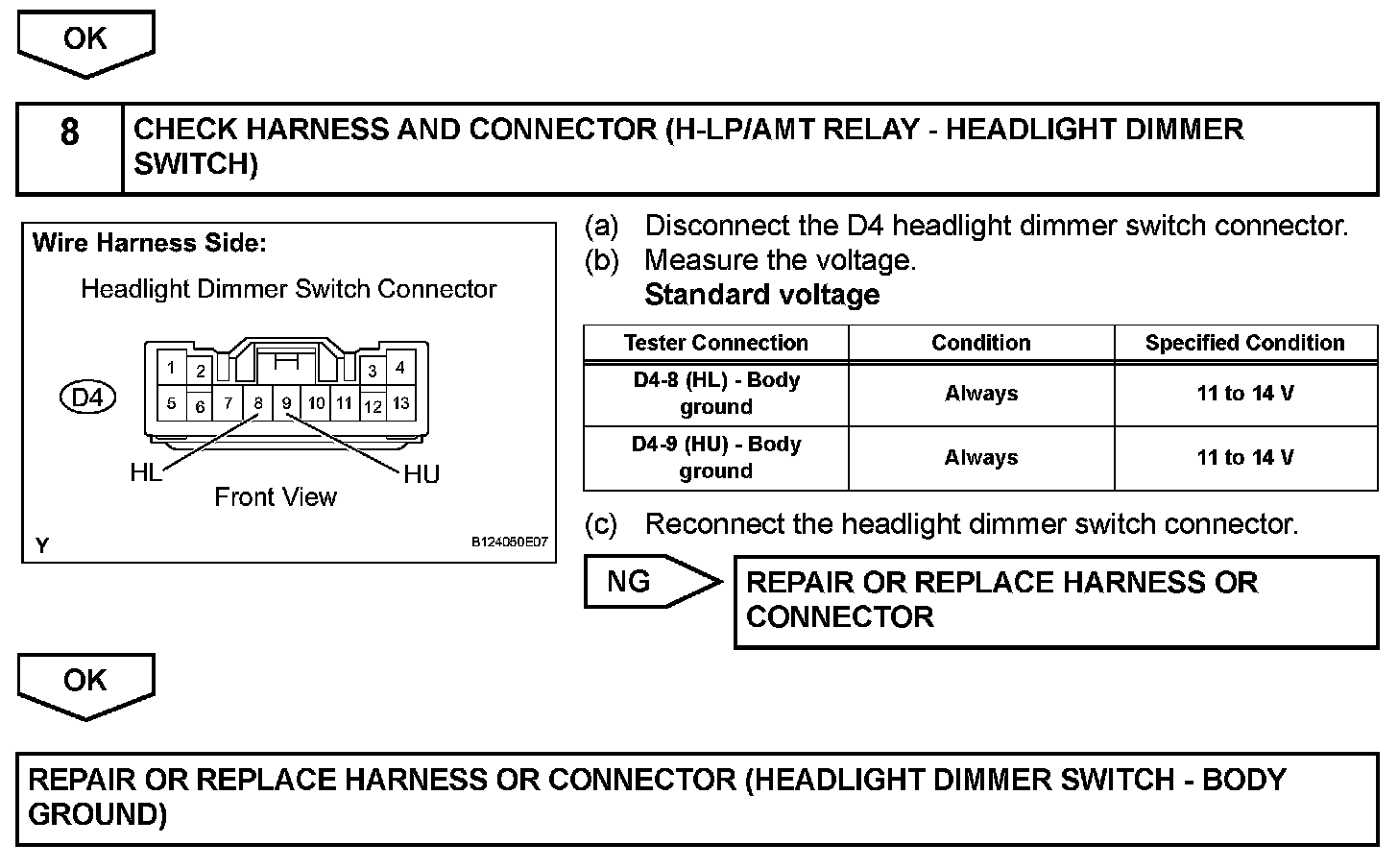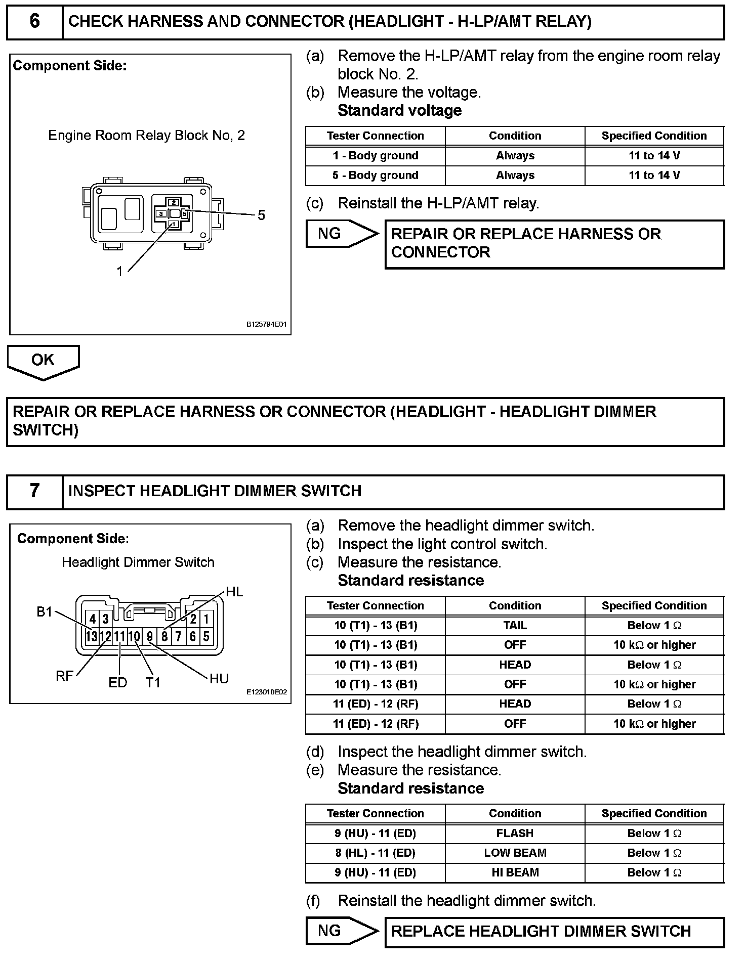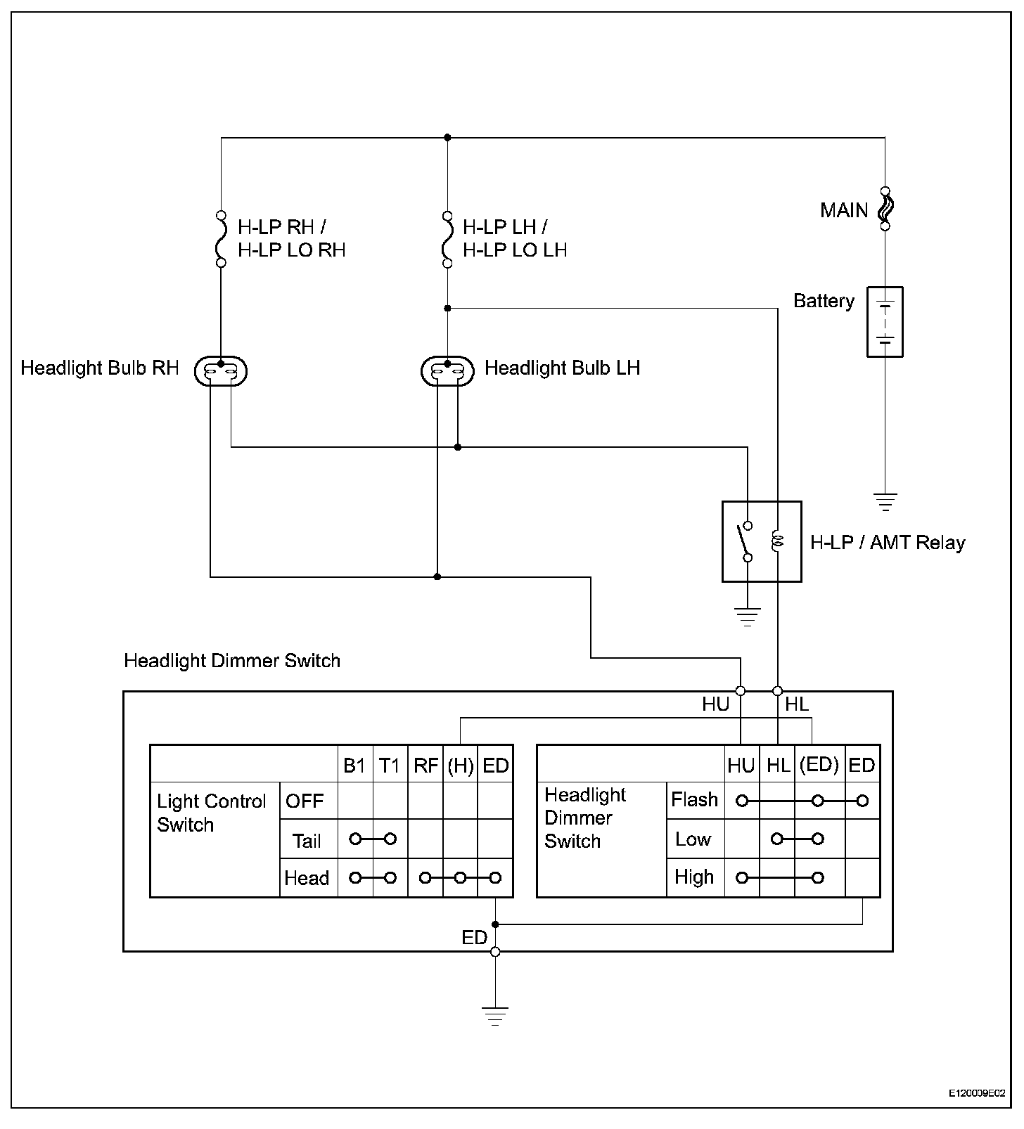 When the light control switch, located on the headlight dimmer switch, is turned to the HEAD position, the H-LP/AMT relay illuminates the headlights.