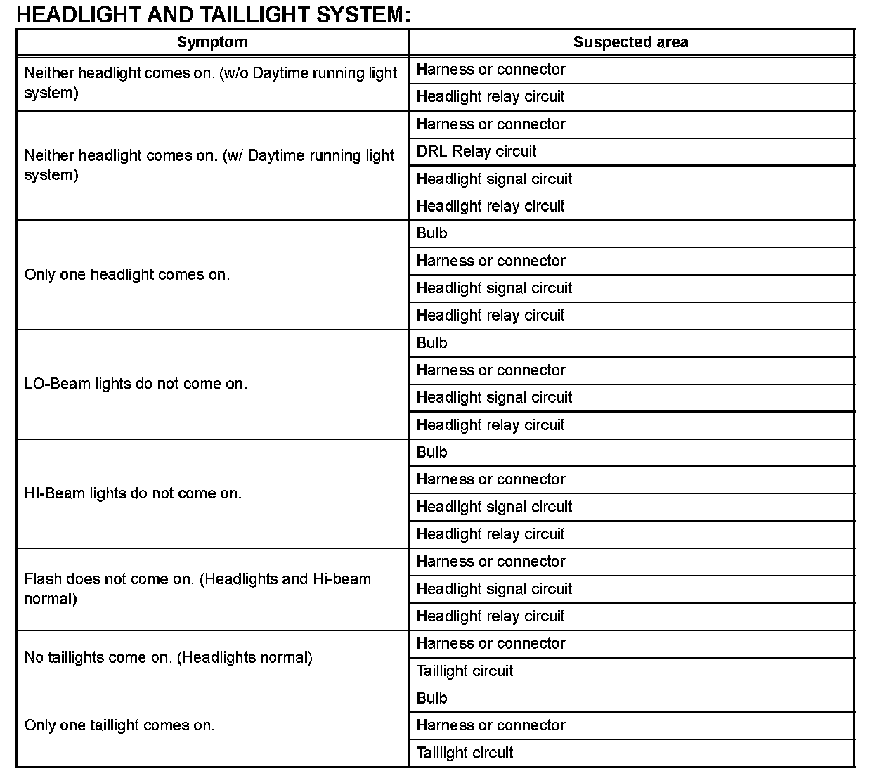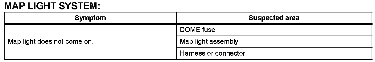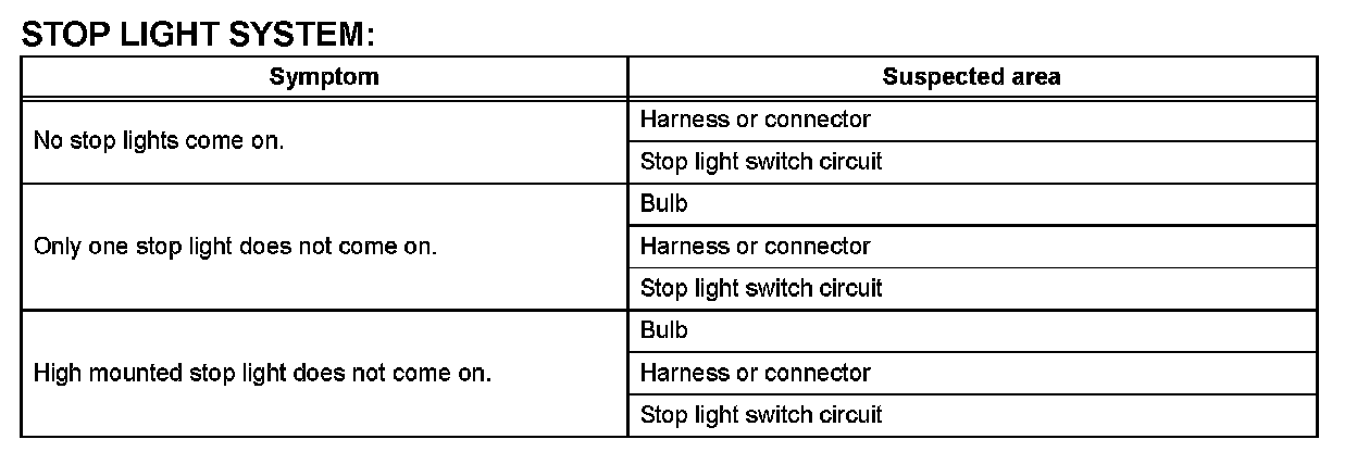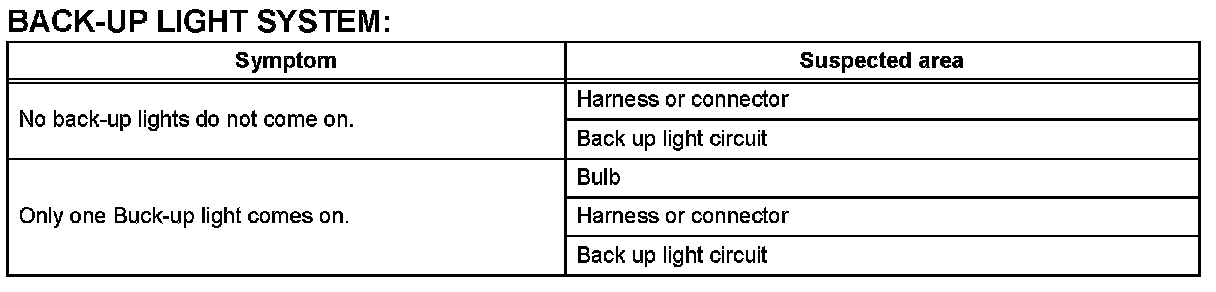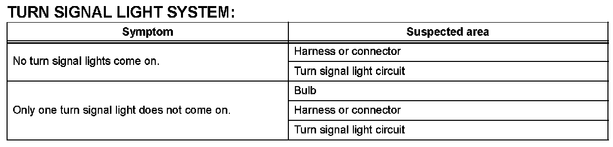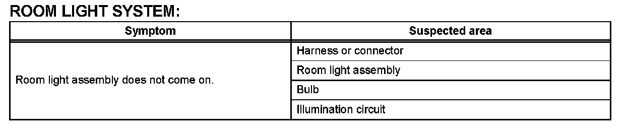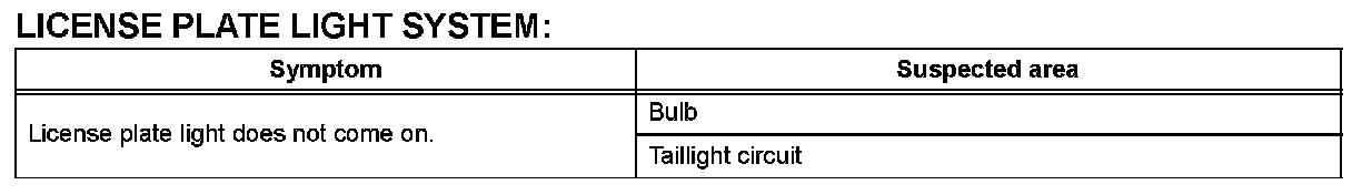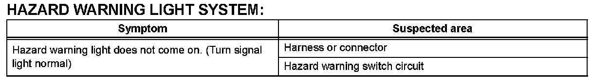 PROBLEM SYMPTOMS TABLEHINT: Use the table given to help determine the causes of the problem symptom. The potential causes of the symptoms are listed in order of probability in the "Suspected Area" column of the table. Check each symptom by checking the suspected areas in the order they are listed. Replace parts as necessary.