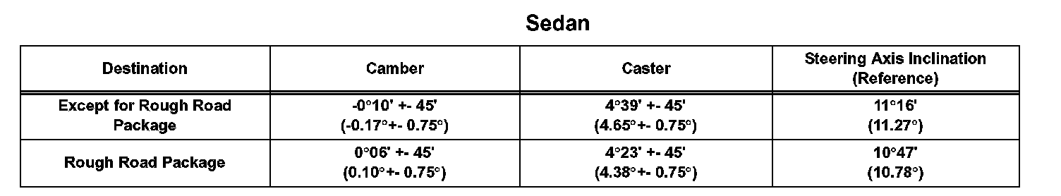 ^ The tolerance for the difference between the left and right wheels is 30' (0.5°) or less for both the camber and caster.