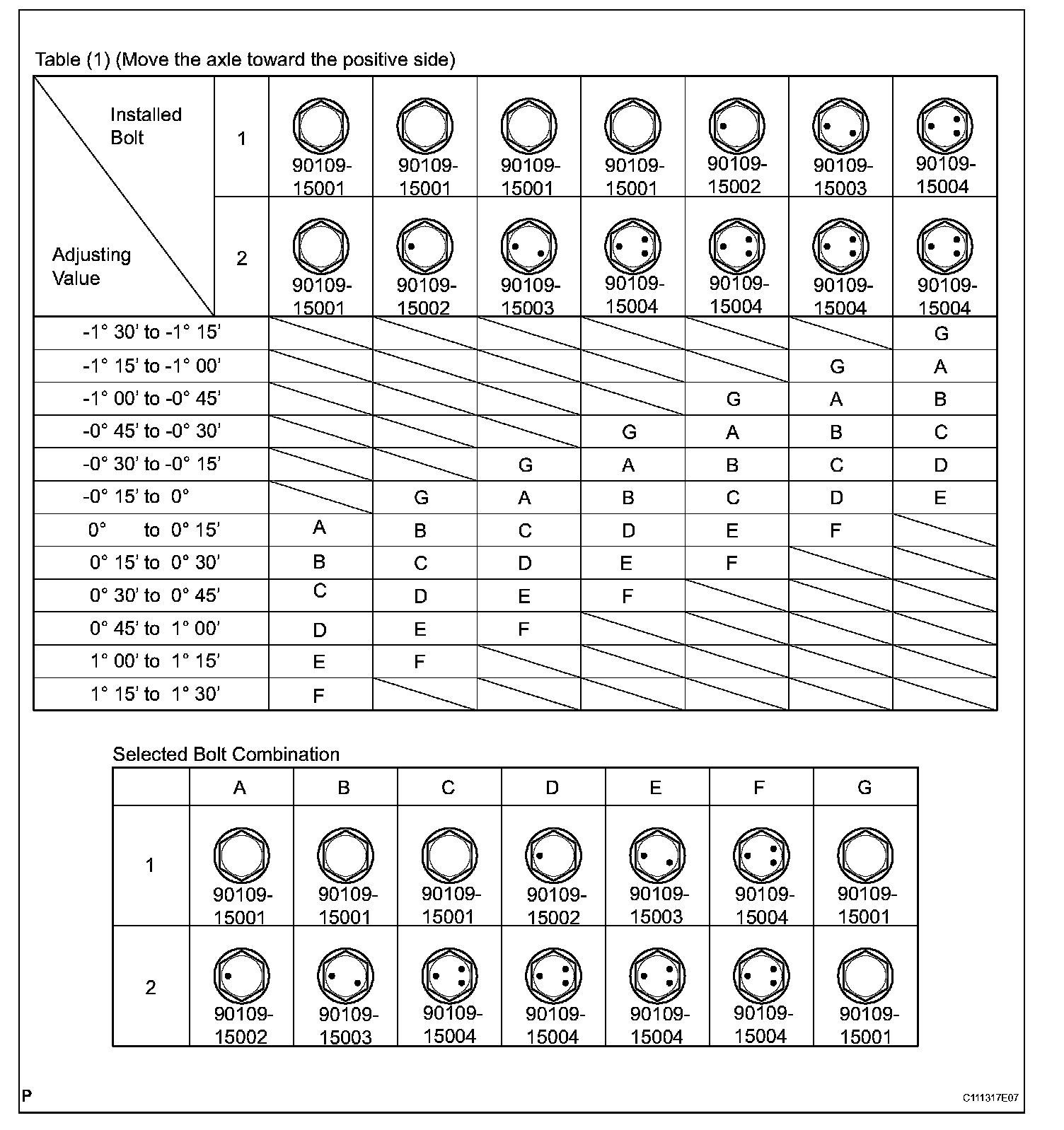 Check the combination of installed bolts. Select appropriate bolts from the table to adjust the camber to within the specified range.