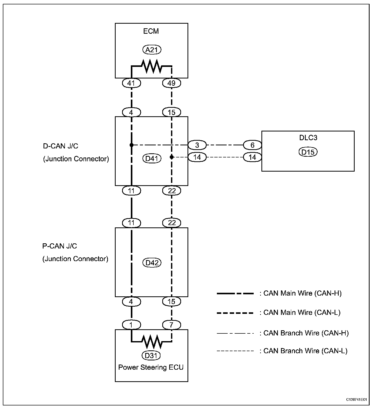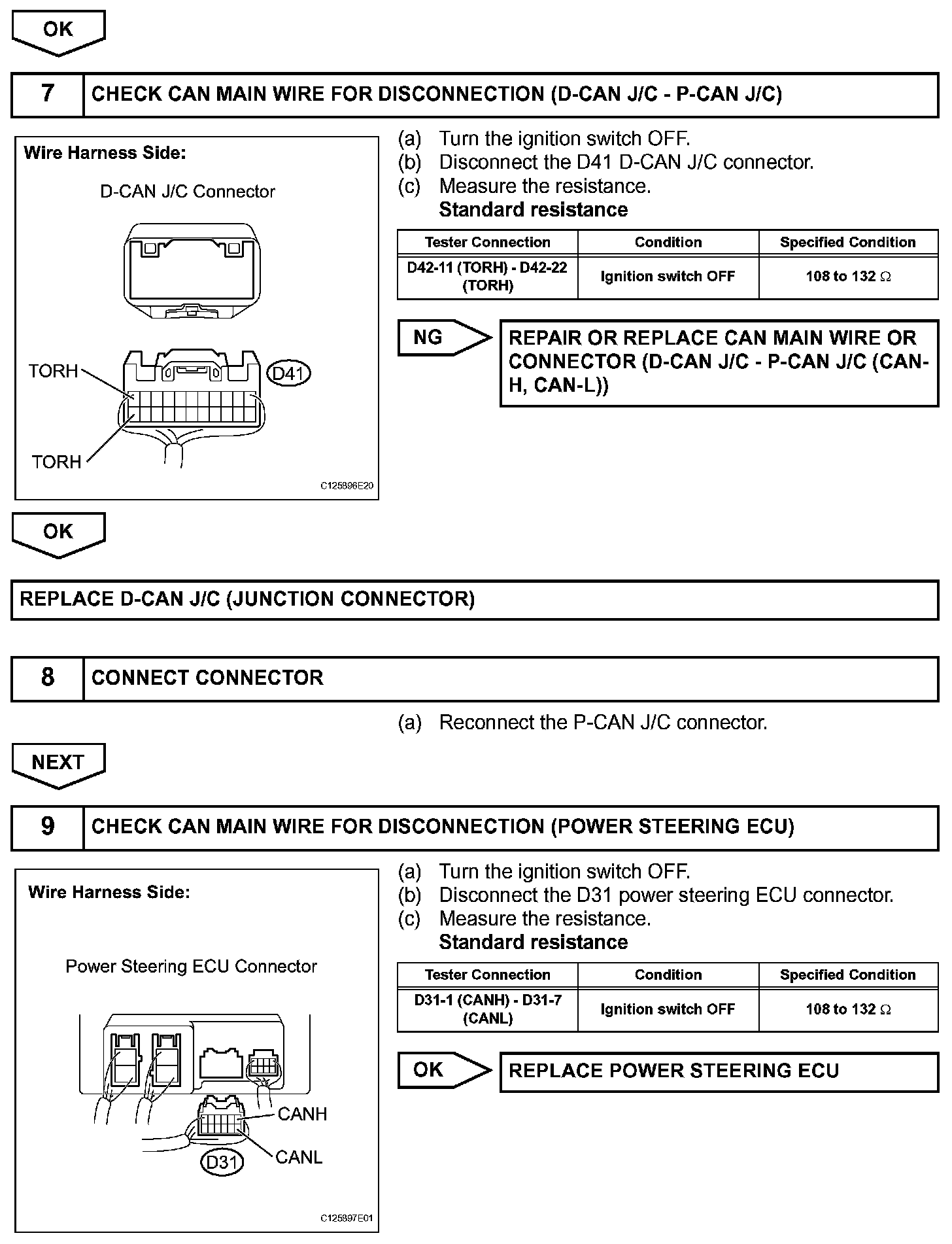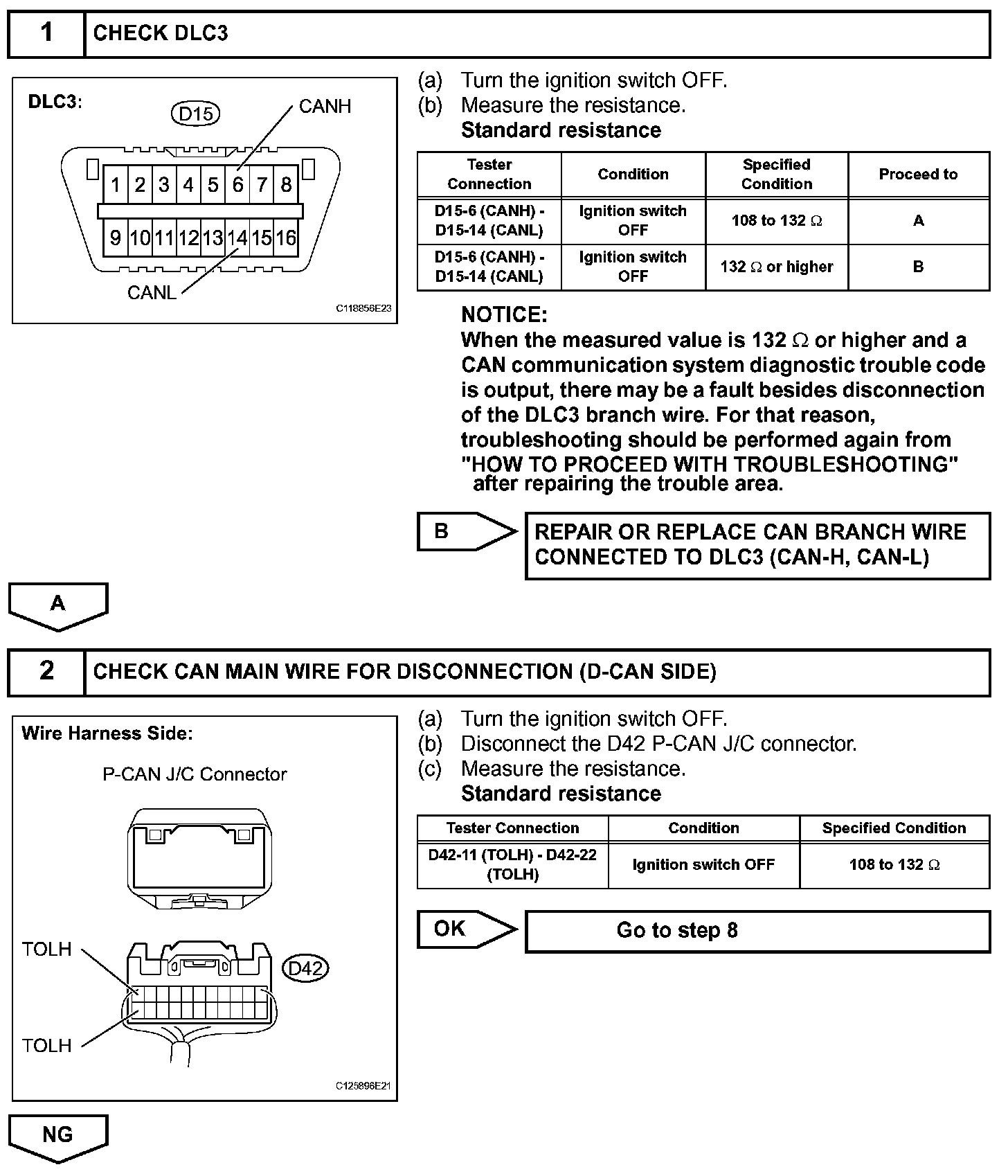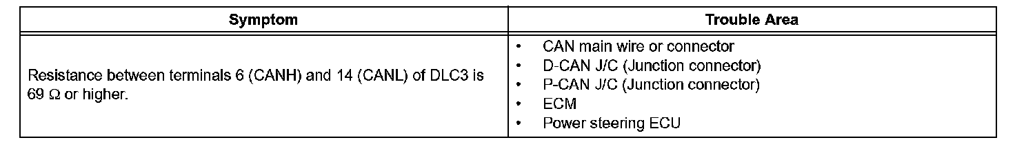 There may be an open circuit in the CAN main wire and/or the DLC3 branch wire when the resistance between terminals 6 (CANH) and 14 (CANL) of the DLC3 is 69 ohms or higher.