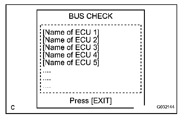 - Display the "BUS CHECK" screen for approximately 1 minute and check for ECUs and sensors that a not indicated on the screen.