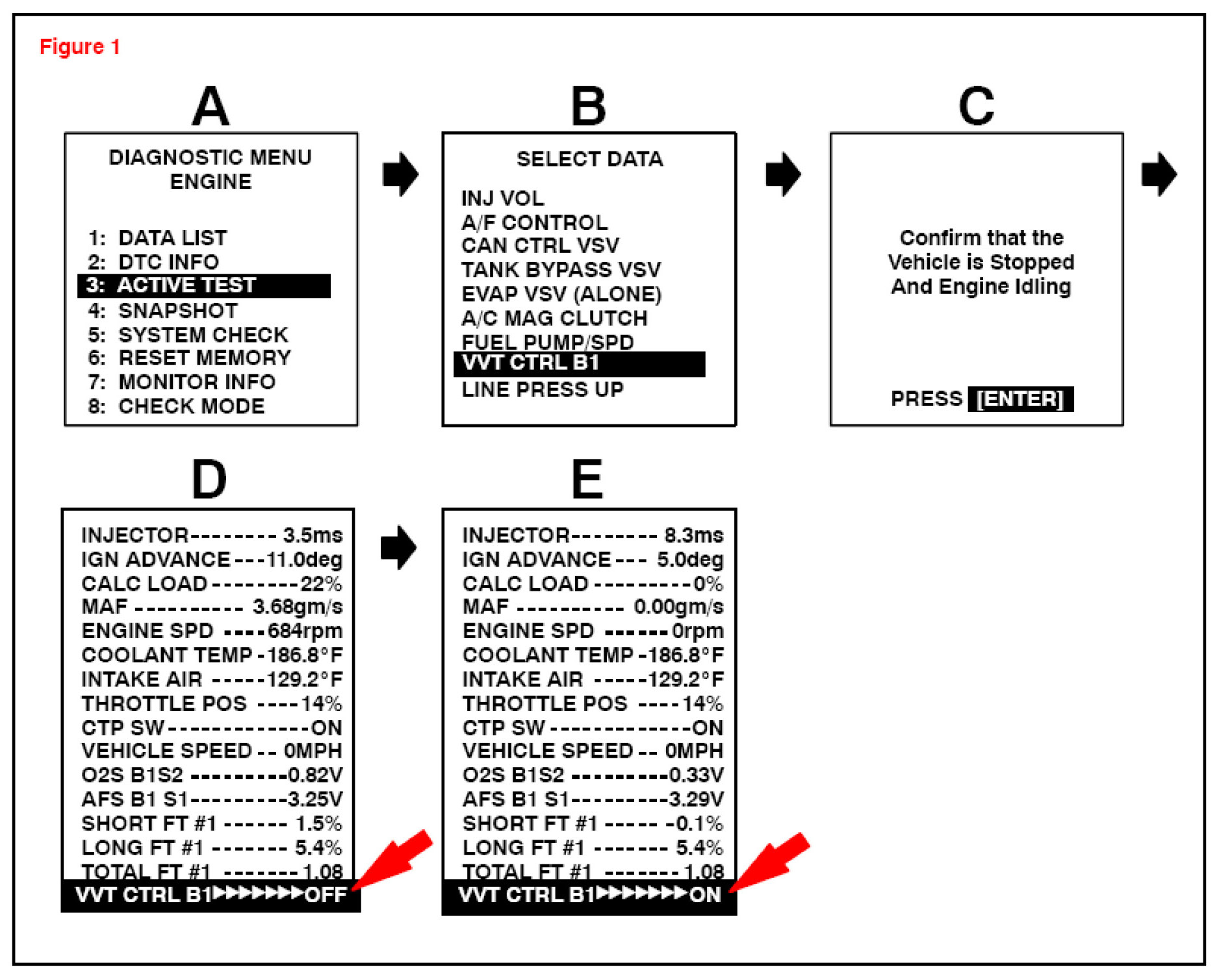 1. Referring to the screen flow in Figure 1, connect the Toyota Diagnostic Tester to the vehicle and select the VVT Control Bank 1 Active Test (VVT CTRL B1) from the Active Test Menu.