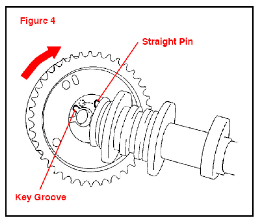 C. Install the timing gear assembly onto the camshaft with the straight pin slightly to the right of the key groove as shown in Figure 4.