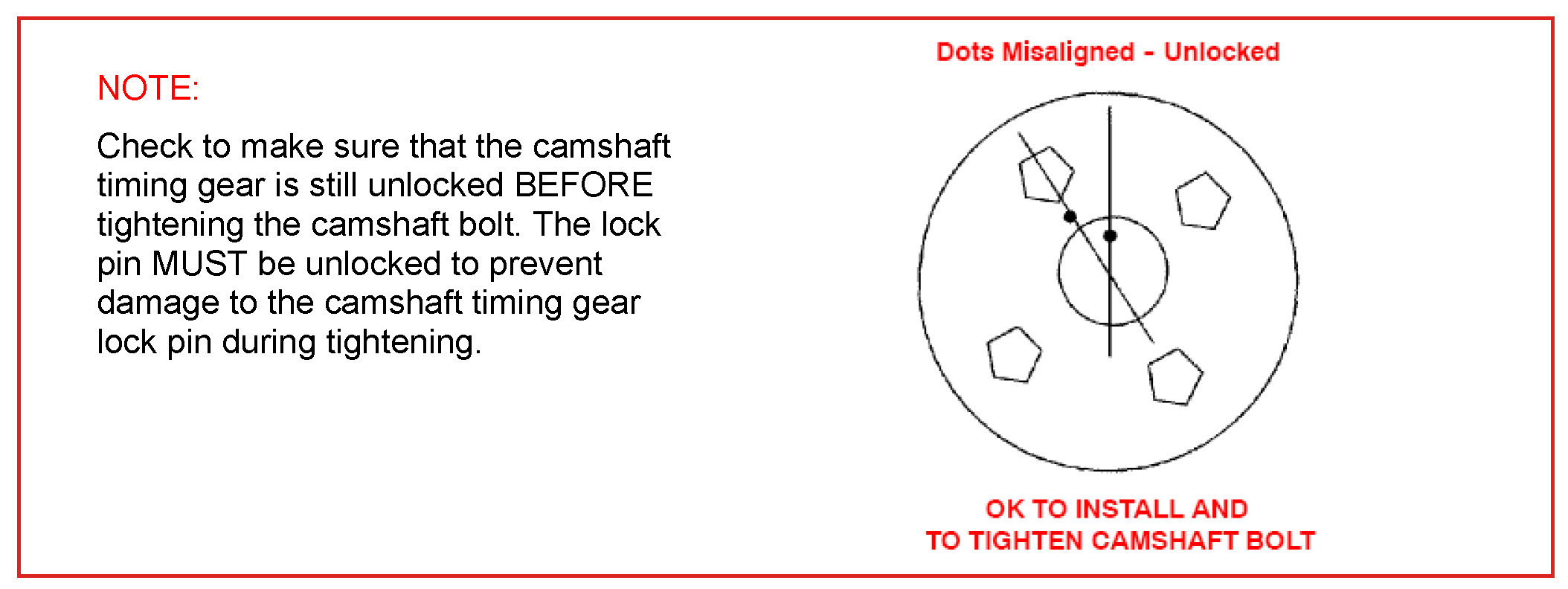 G. After torquing the camshaft bolt, rotate the camshaft timing gear in a clockwise direction while holding the camshaft stationary until the dots are aligned, thereby engaging the camshaft timing gear lock pin.