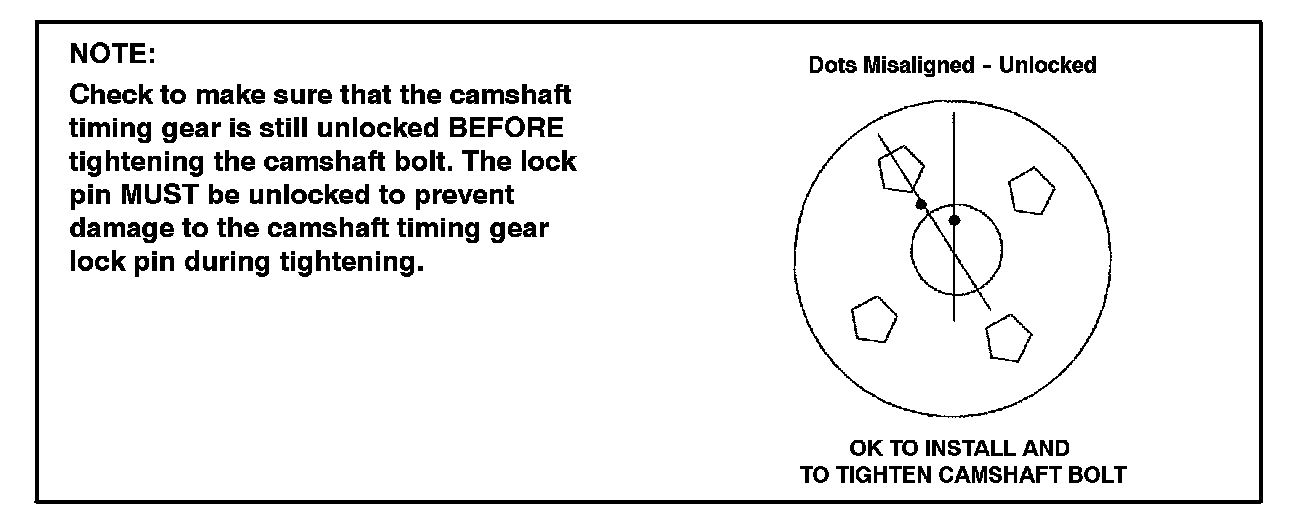 G. After torquing the camshaft bolt, rotate the camshaft timing gear in a clockwise direction while holding the camshaft stationary until the dots are aligned, thereby engaging the camshaft timing gear lock pin.