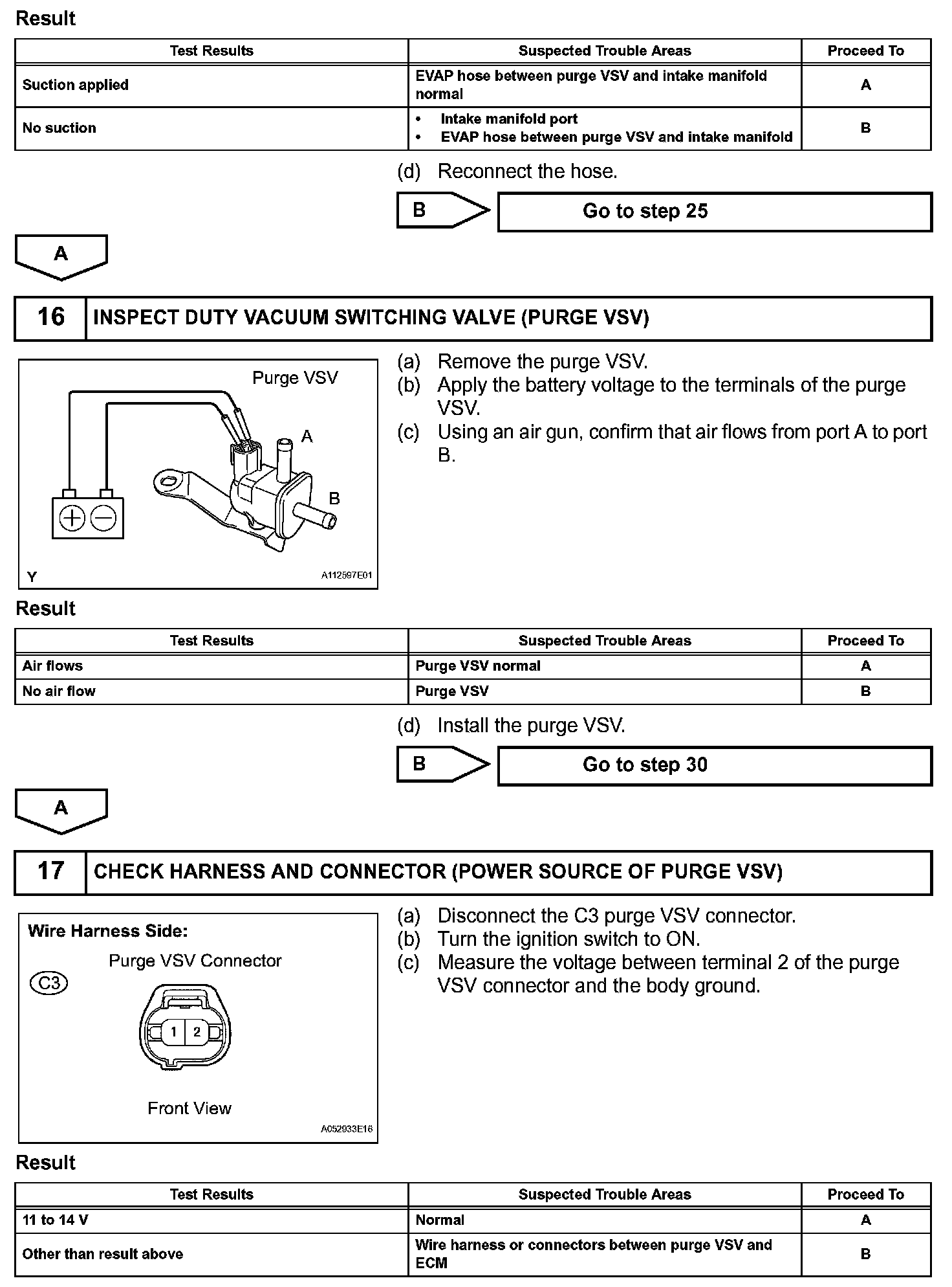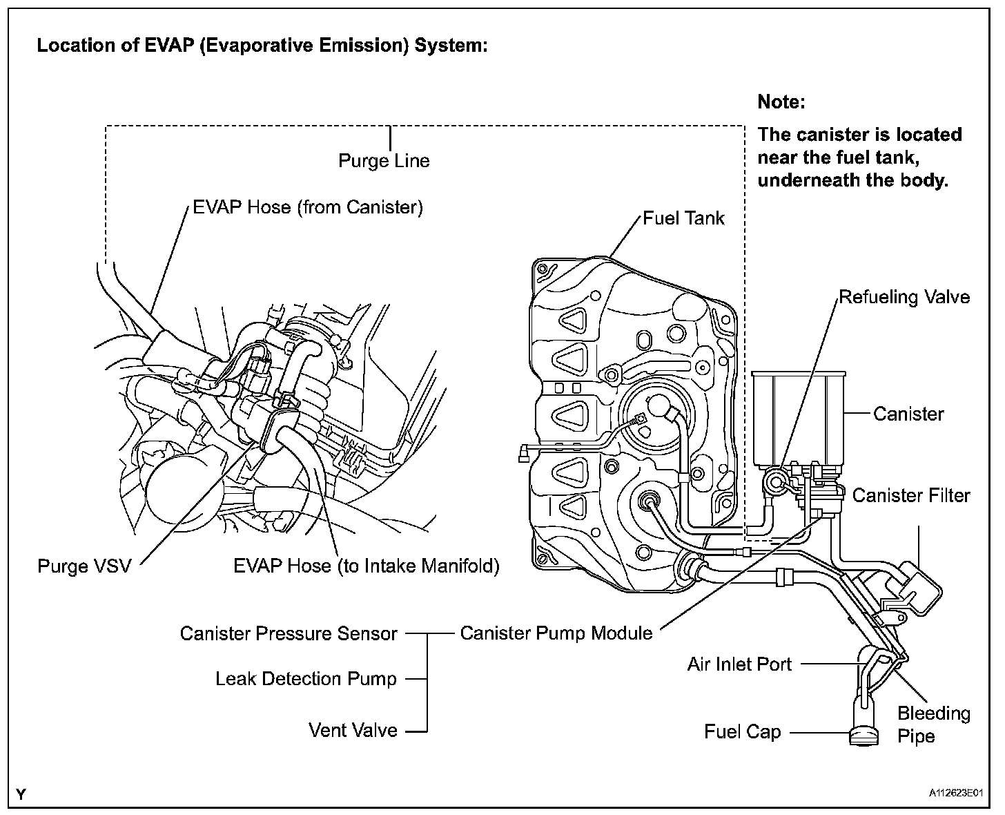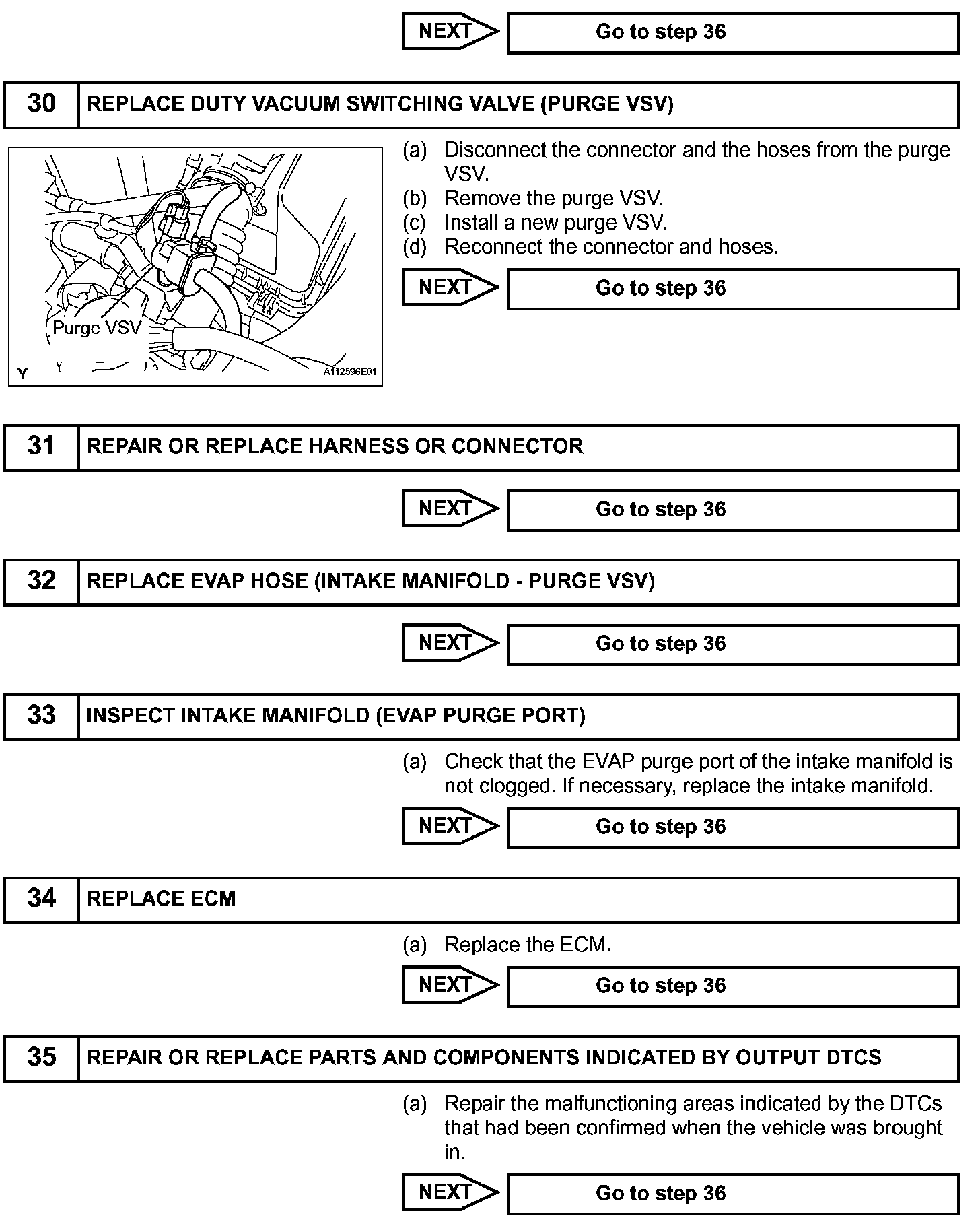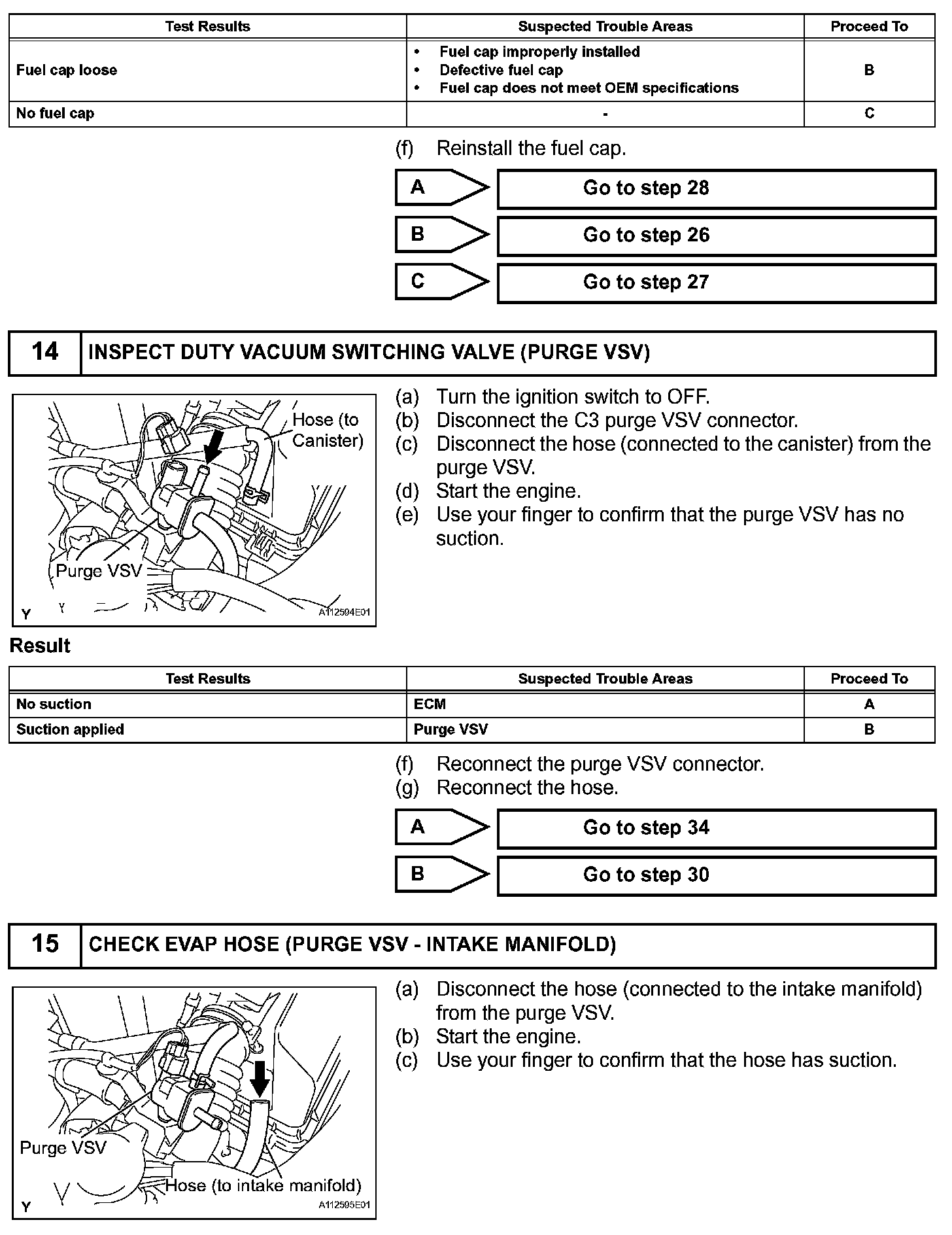 While the engine is running, if a predetermined condition (closed-loop etc.) is met, the purge VSV is opened by the ECM and stored fuel vapors in the canister are purged into the intake manifold. The ECM changes the duty cycle ratio of the purge VSV to control purge flow volume.
