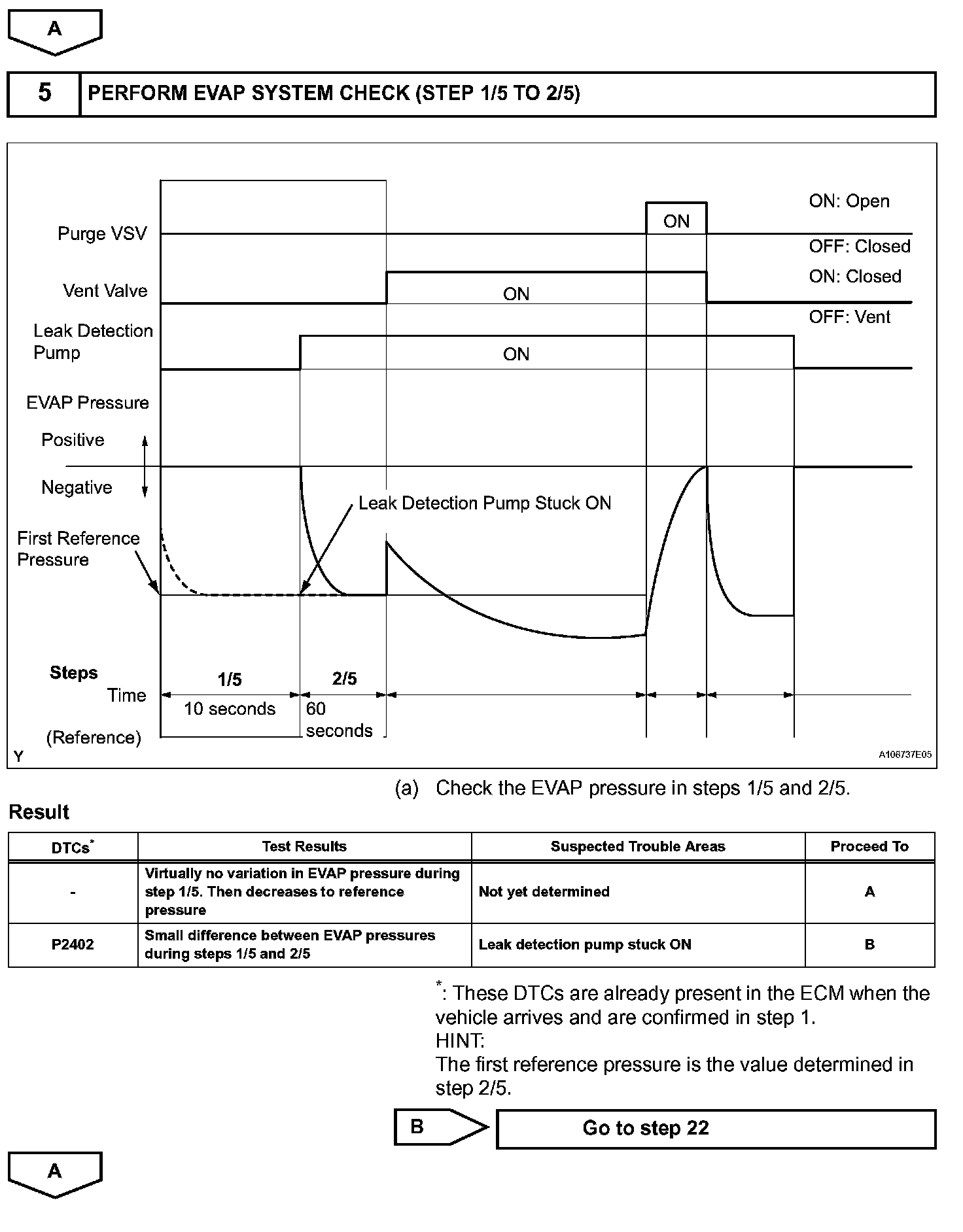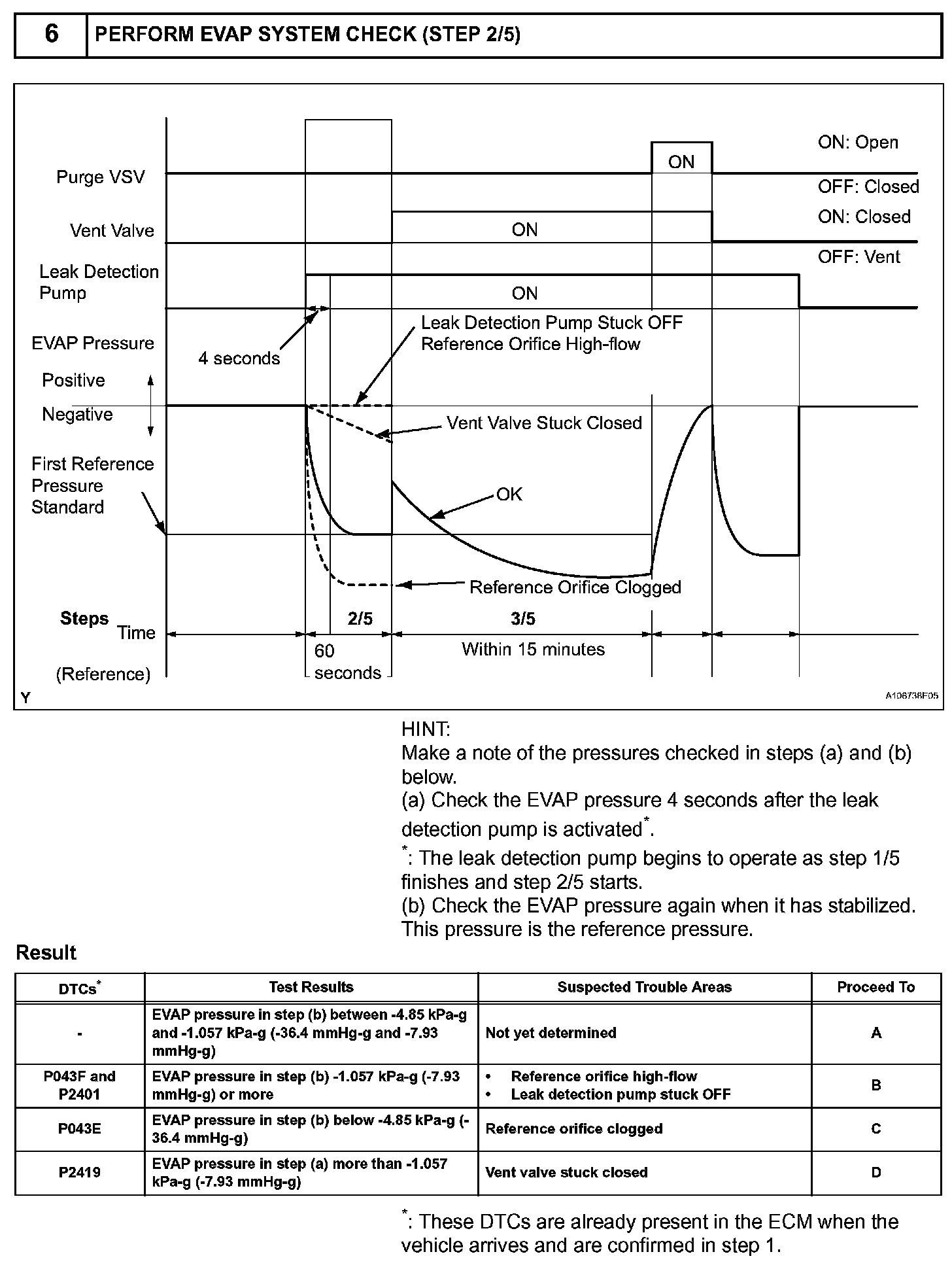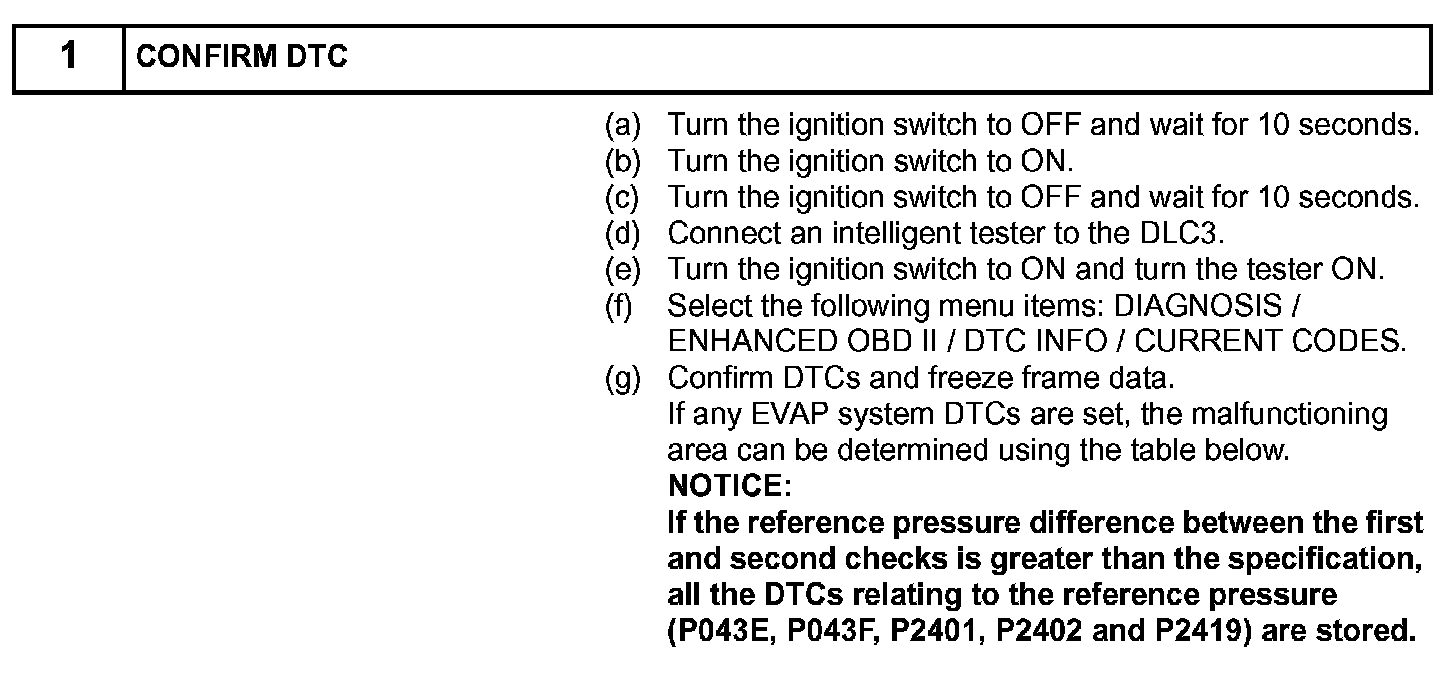NOTE: If the reference pressure difference between the first and second checks is greater than the specification, all the DTCs relating to the reference pressure (P043E, P043F, P2401, P2402 and P2419) are stored.