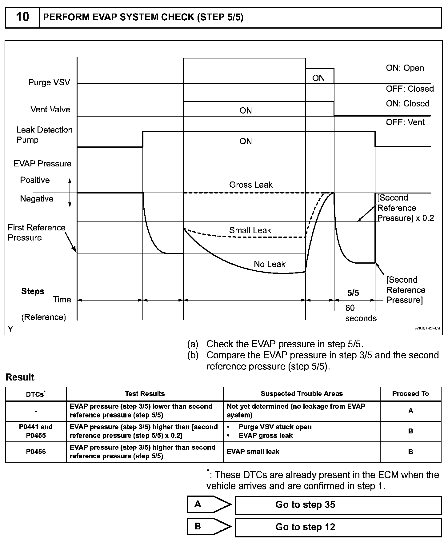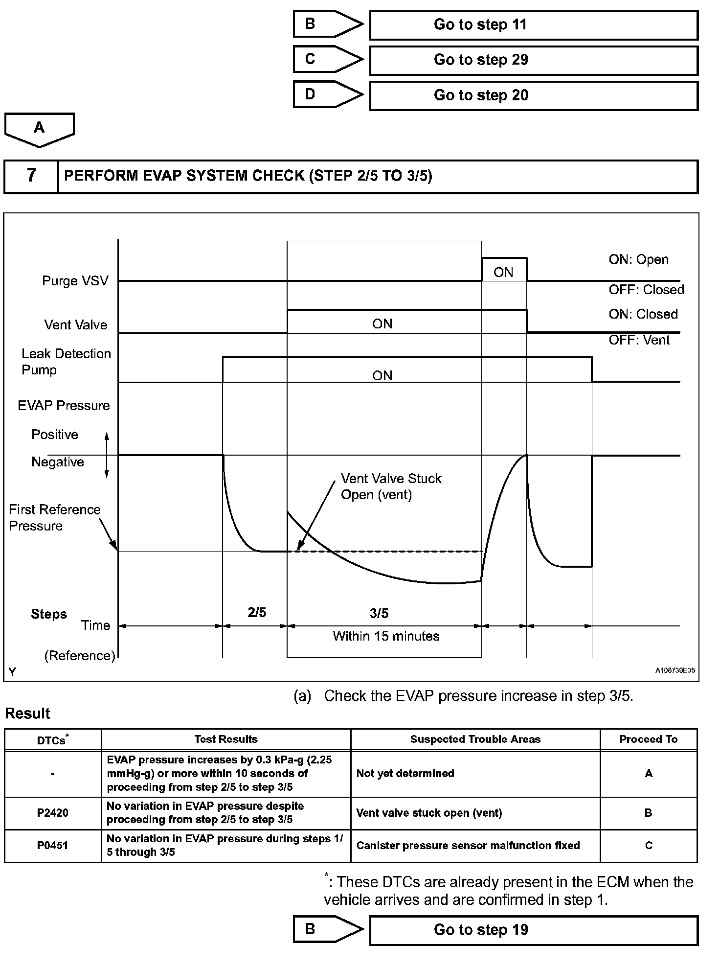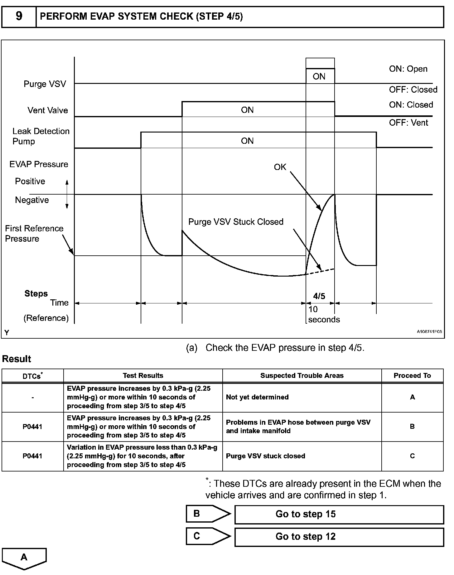 The vent valve is turned OFF (open) and the EVAP pressure is measured. If the variation in the pressure is less than 0.5 kPa-g (3.75 mm Hg-g), the ECM interprets this as the purge VSV being stuck closed, and illuminates the MIL and sets DTC P0441 (2 trip detection logic).