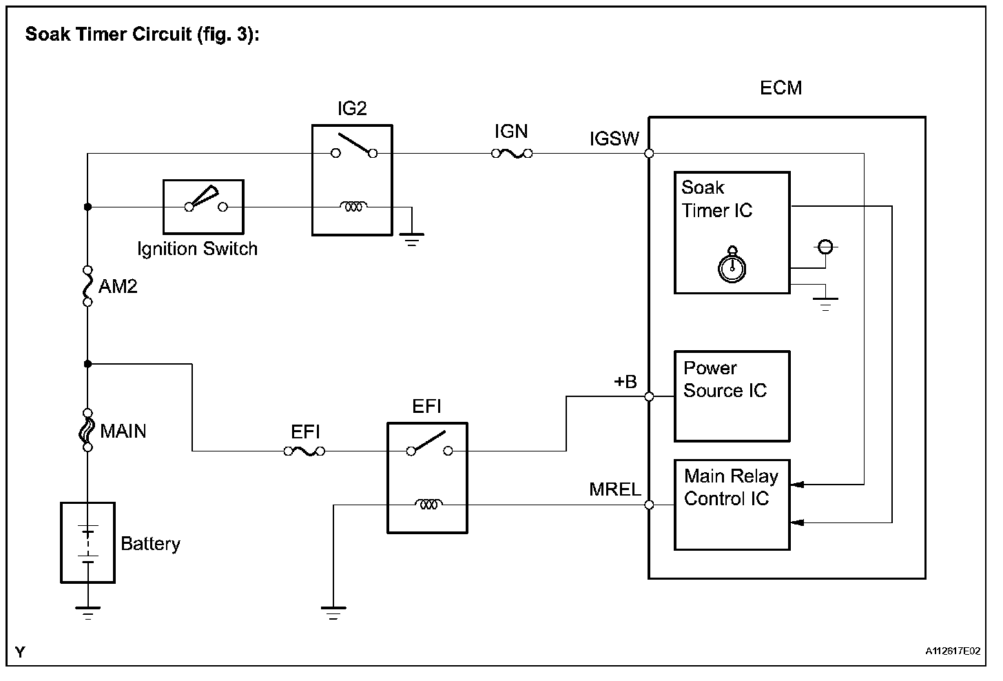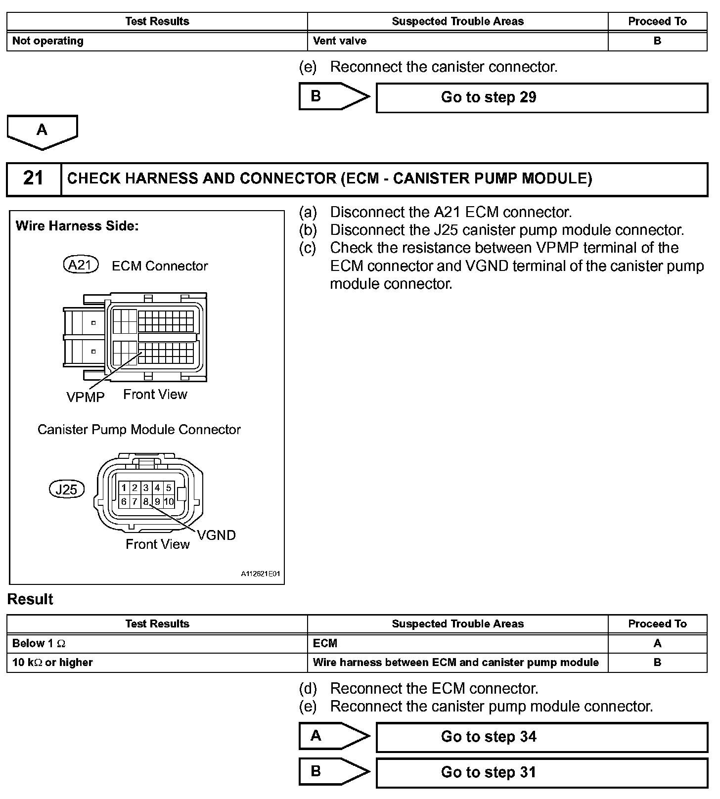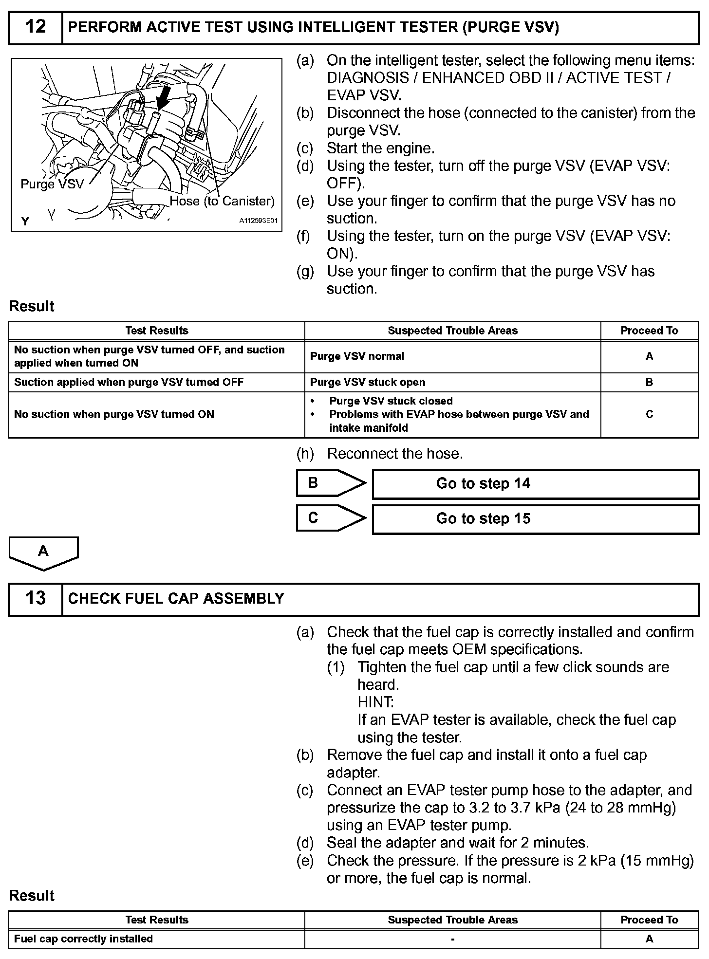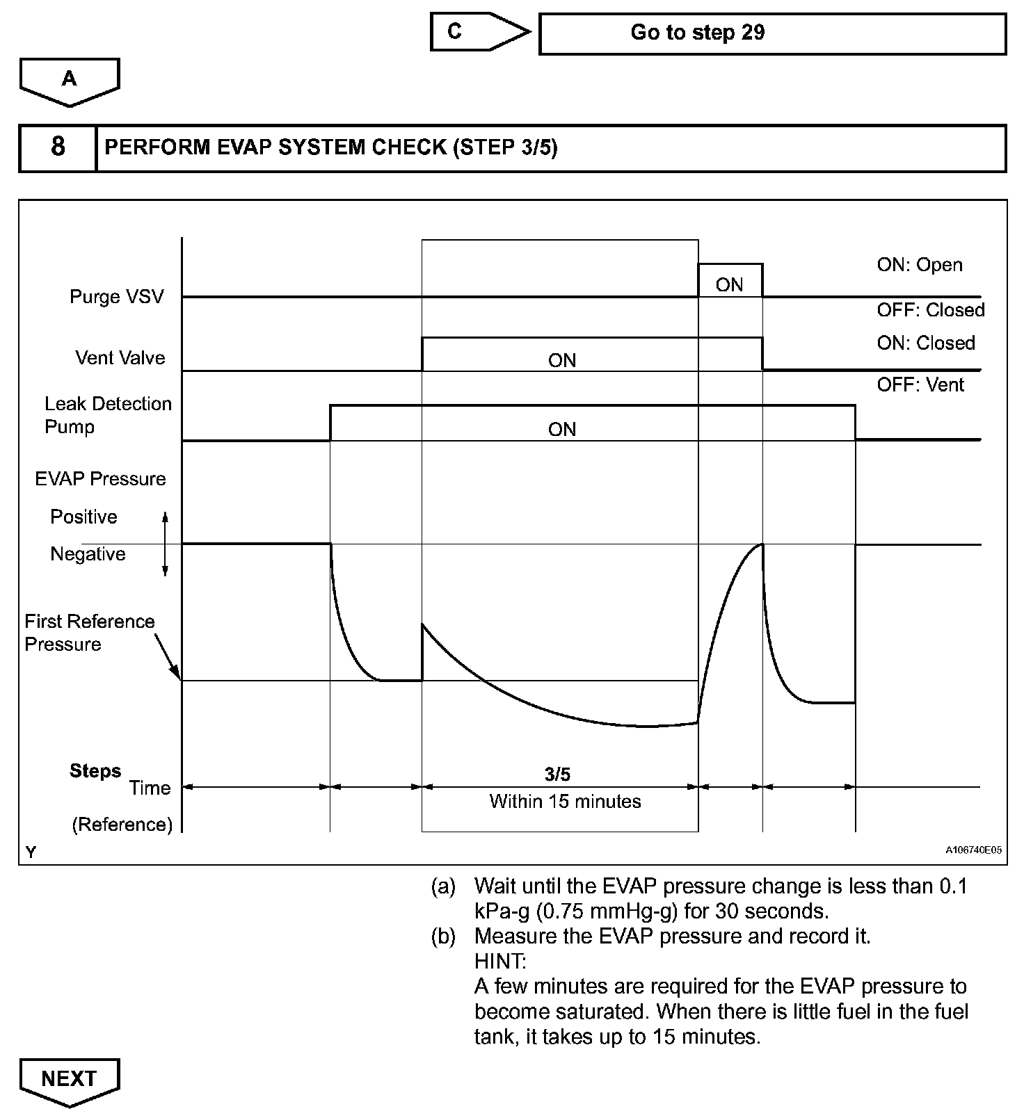 The vent valve is turned OFF (open) and the EVAP pressure is measured. If the variation in the pressure is less than 0.5 kPa-g (3.75 mm Hg-g), the ECM interprets this as the purge VSV being stuck closed, and illuminates the MIL and sets DTC P0441 (2 trip detection logic).