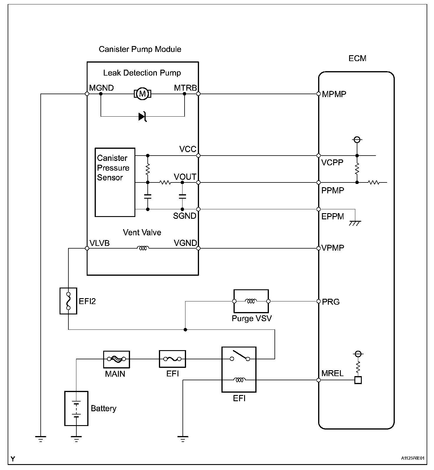 This monitor checks for EVAP (Evaporative Emission) system leaks and canister pump module malfunctions. The monitor starts 5 hours*. after the ignition switch is turned to OFF. At least 5 hours are required for the fuel to cool down to stabilize the EVAP pressure, thus making the EVAP system monitor more accurate. The leak detection pump creates negative pressure (vacuum) in the EVAP system and the pressure is measured. Finally, the ECM monitors for leaks from the EVAP system, and malfunctions in both the canister pump module and purge VSV, based on the EVAP pressure.