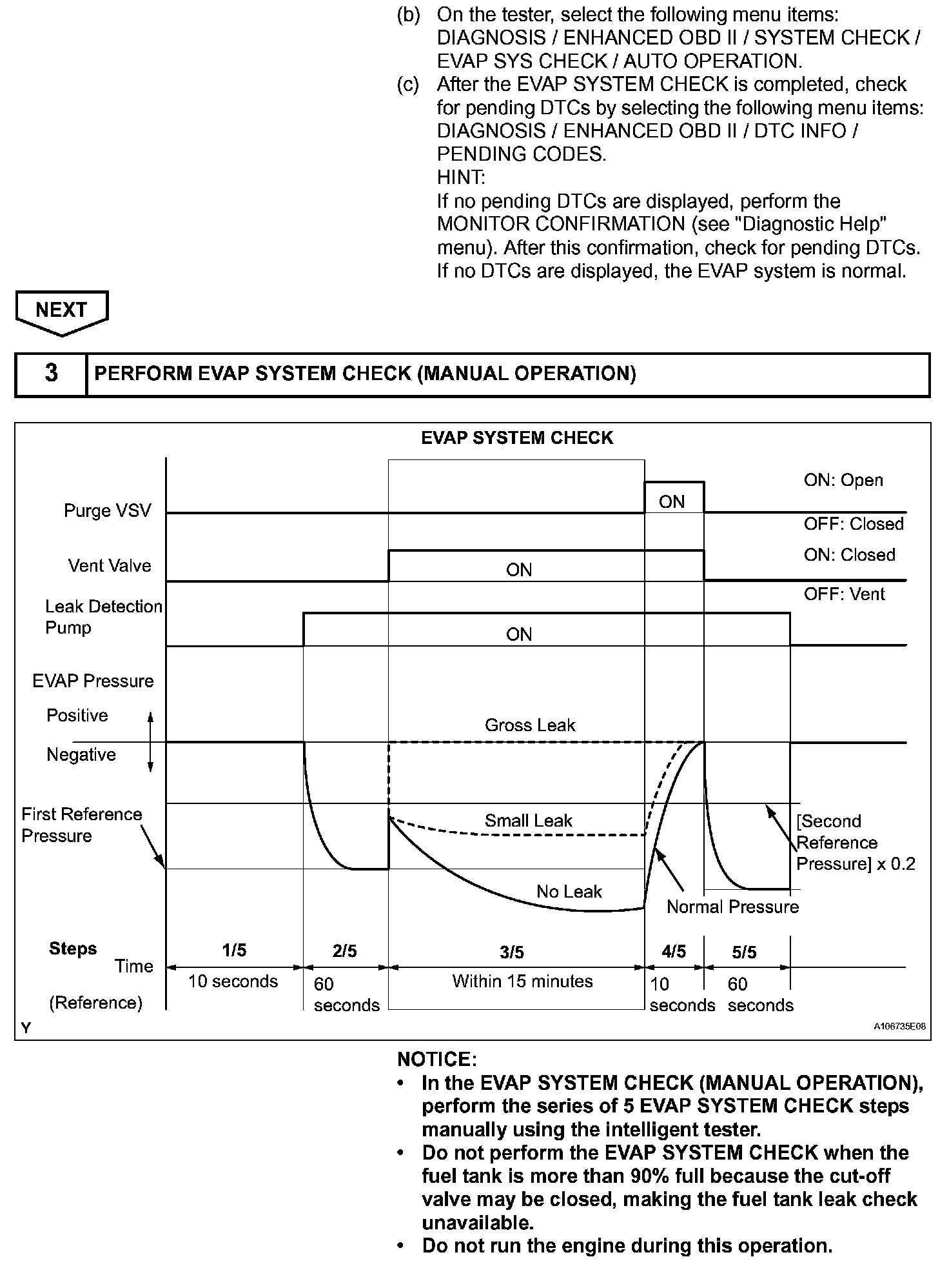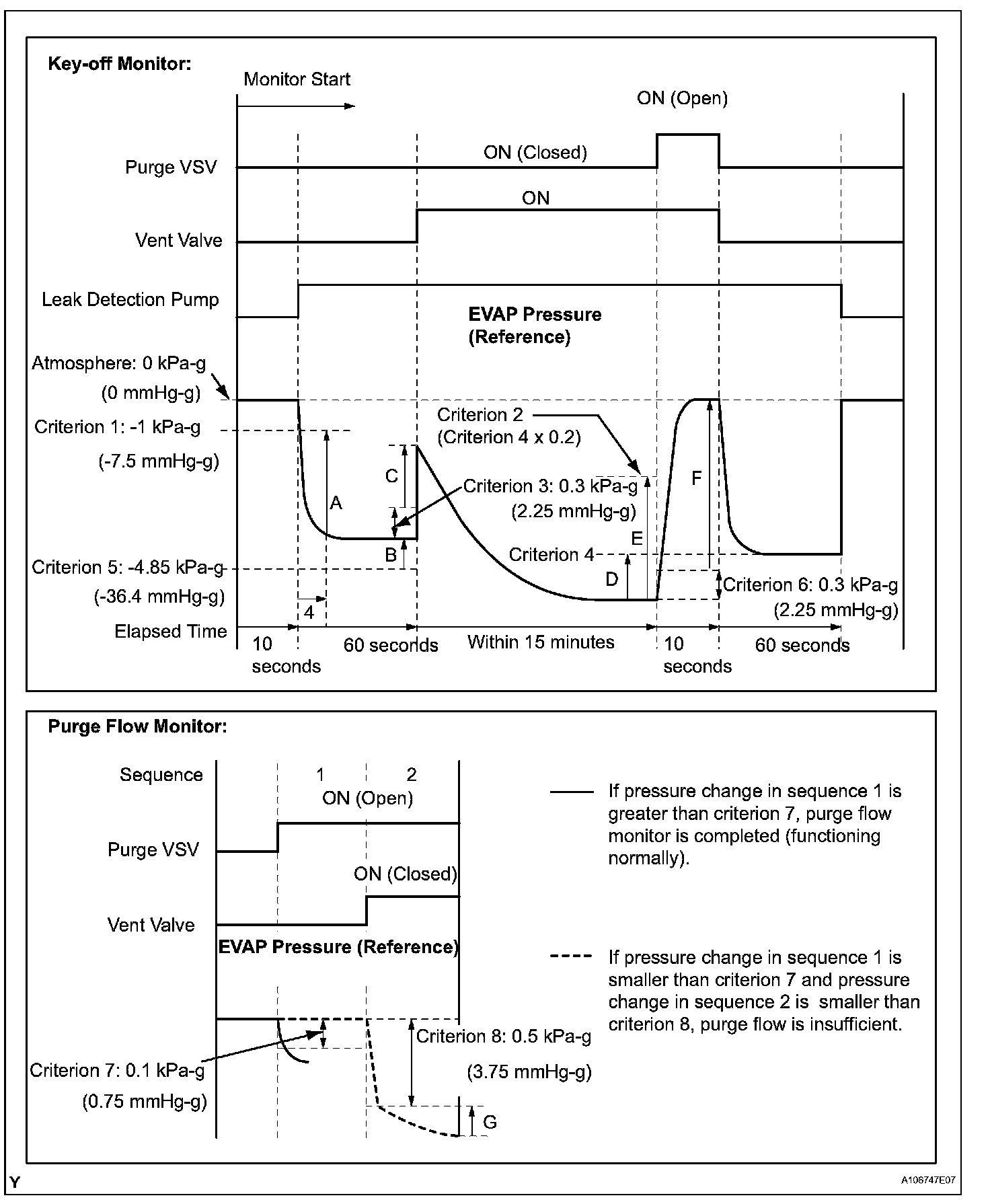 While the engine is running and the purge VSV (Vacuum Switching Valve) is ON (open), the ECM monitors the purge flow by measuring the EVAP pressure change. If negative pressure is not created, the ECM begins the 2nd monitor.