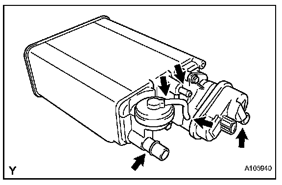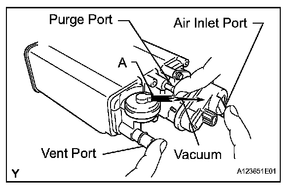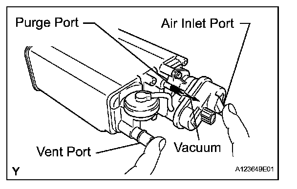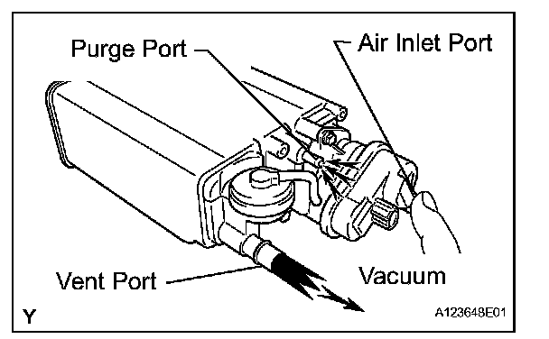 1. While holding the vent and air inlet ports closed, apply vacuum at 3.43 kPa (35.0 kgf/ sq.cm, 25.7 mmHg) into the purge port, and check that the vacuum is maintained for 1 minute.