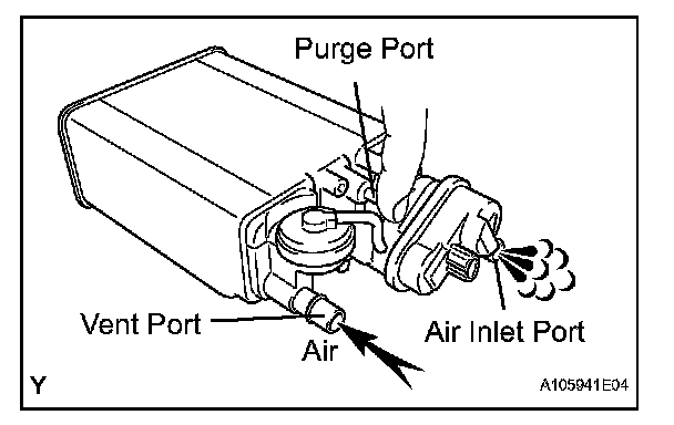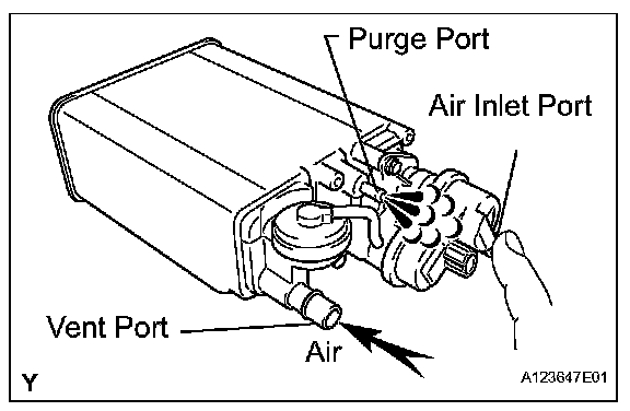 1. While holding the purge port closed, blow air at 0.39 kPa (4.0 kgf/sq.cm, 3 mmHg) into the vent port, and check that air flows from the air inlet port.